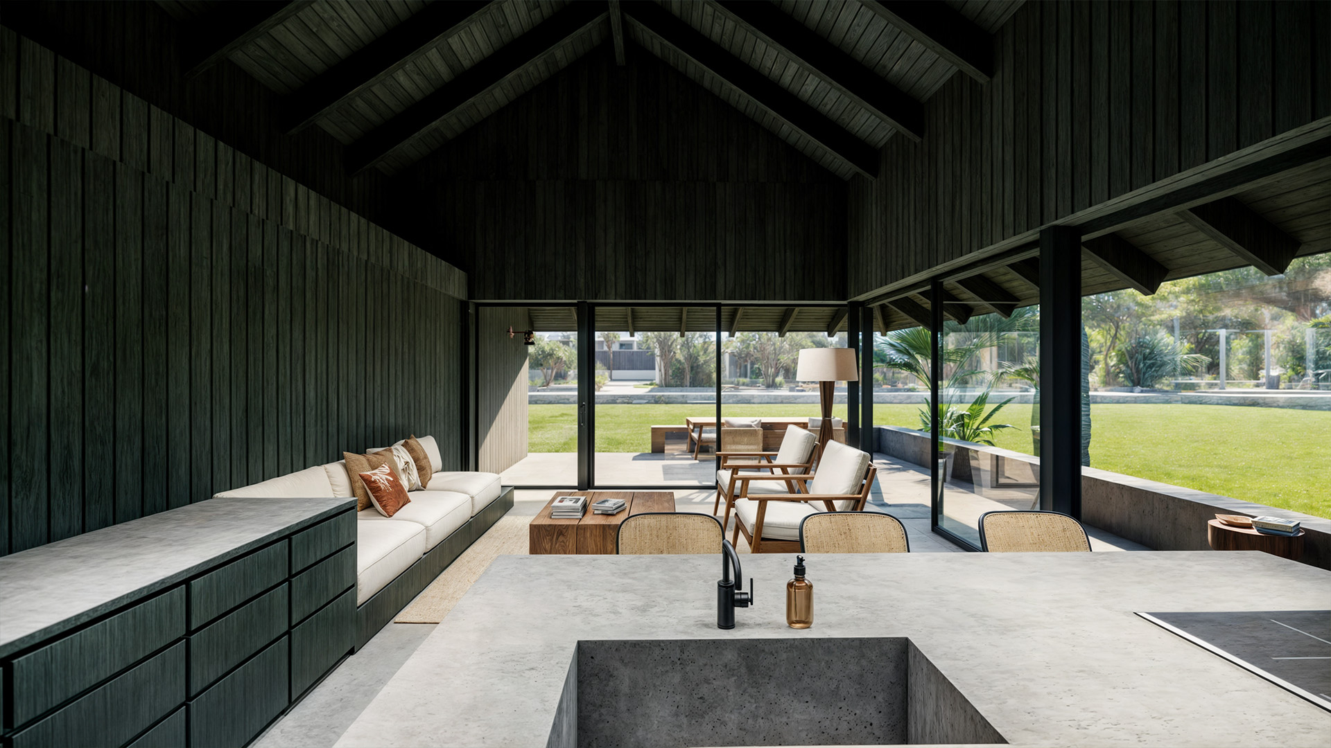 深い緑色の外壁とシングル葺の屋根が印象的な建築。引戸を開け放つと、