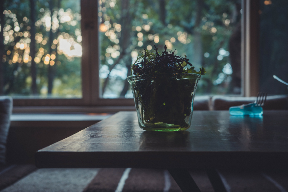 「光に愛されるガラスを置いている」という言葉の通り、光の絞られた仄暗いダイニングでは、横山氏のガラスの器がきらりと上品に輝きます。自宅でも、敢えて光を絞ることで、ガラスの器が集める “普段とは違う光” を楽しむことができそう。