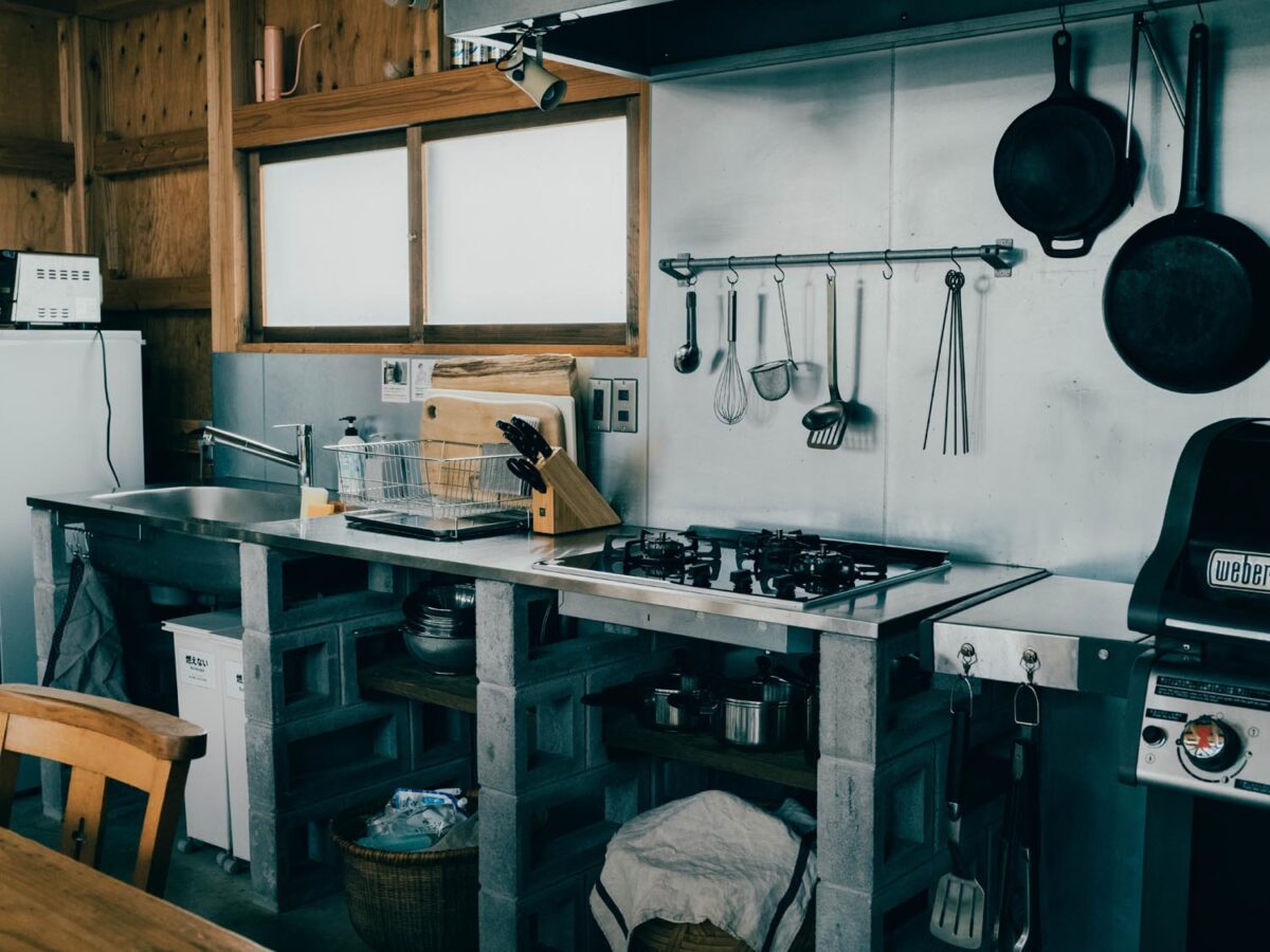 そんな母屋を後にし、中庭を挟んだ離れのダイニングキッチン棟へ。充実した調理器具や食器類。ガス式BBQグリルが完備されているため、天候に左右されずに屋内でBBQを楽しむことも。まさに“団欒”を思わせる空間です。