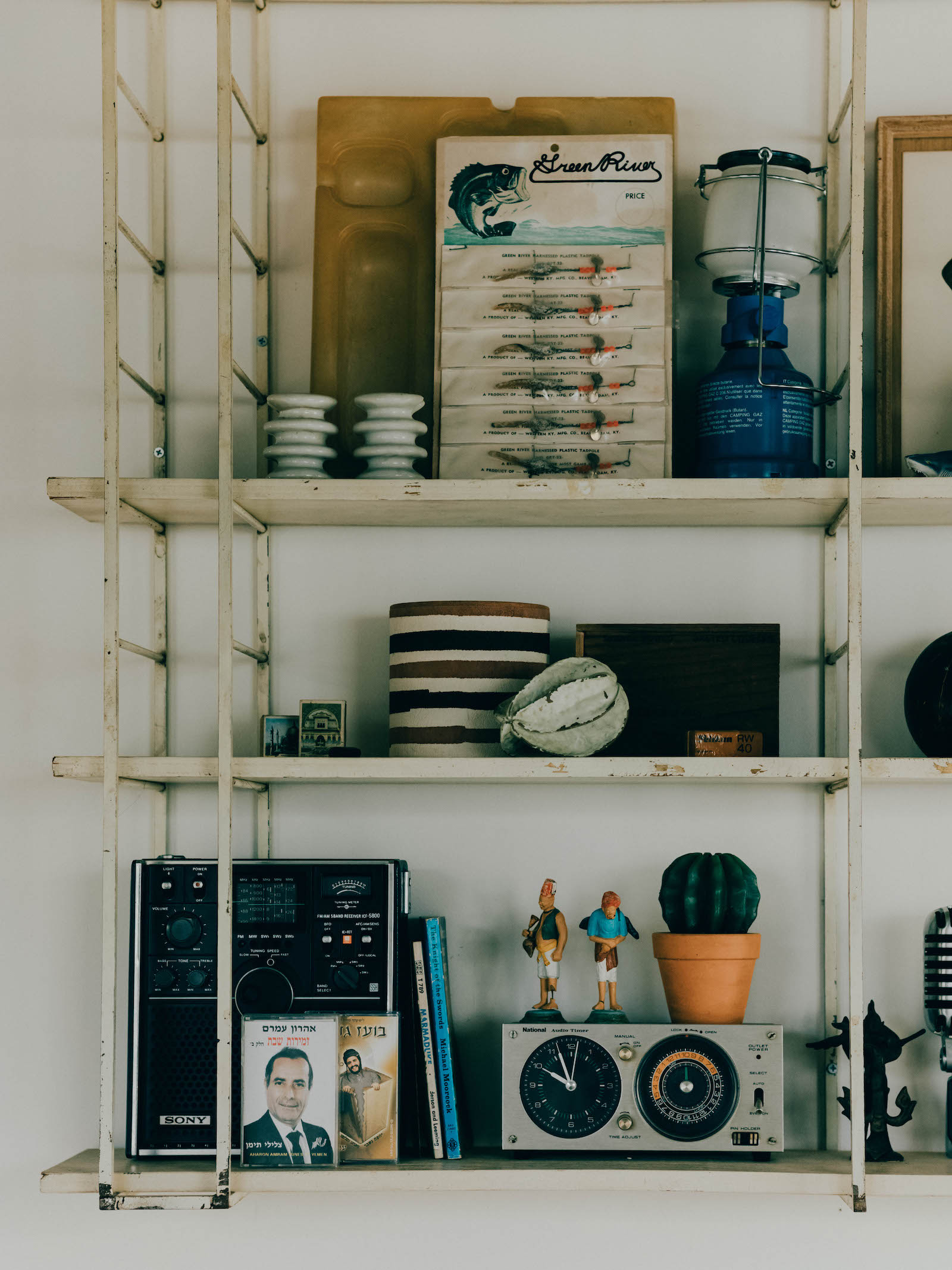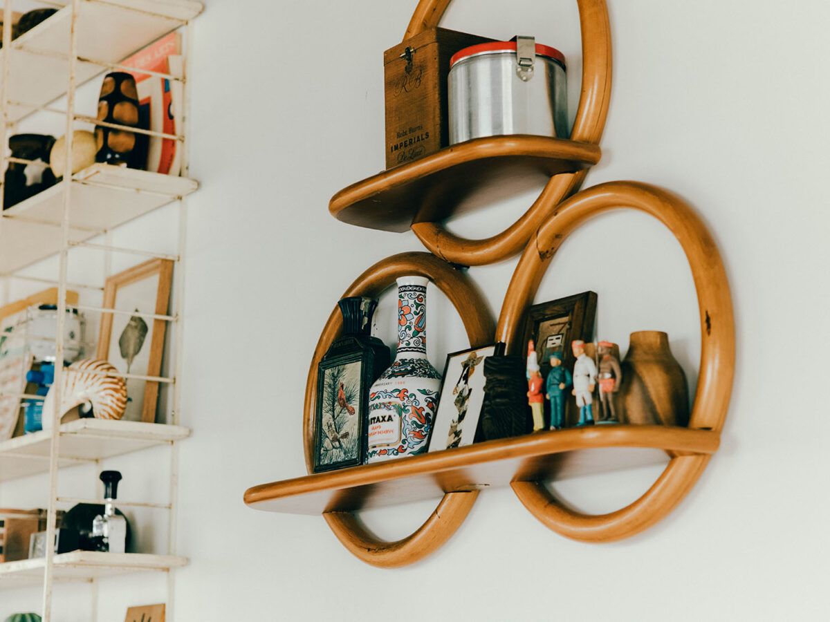 リビングに入るとすぐ目に入るのは、棚にずらりと並ぶ個性的な雑貨たち。愛着を持ってその場に置かれた家具・小物は、いろんな国で作られ、時をまたいでオーナーと出会い、この場所に集いました。オーナーの自宅にあったものを持ってきて、そっと入れ替えることもあるそうです。