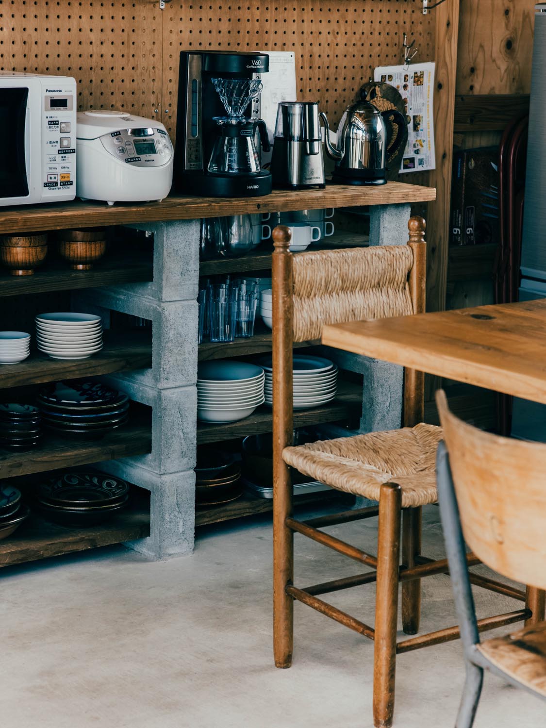 離れは、ゆんたくに集中できる場所として、8人掛けの大きなダイニングテーブルには、椅子がキュッとくっついて並びます。料理をする人も、手を伸ばせばテーブルに手が届くくらい、いい意味で狭く、団欒の “話す時間” に集中できるのだとか。