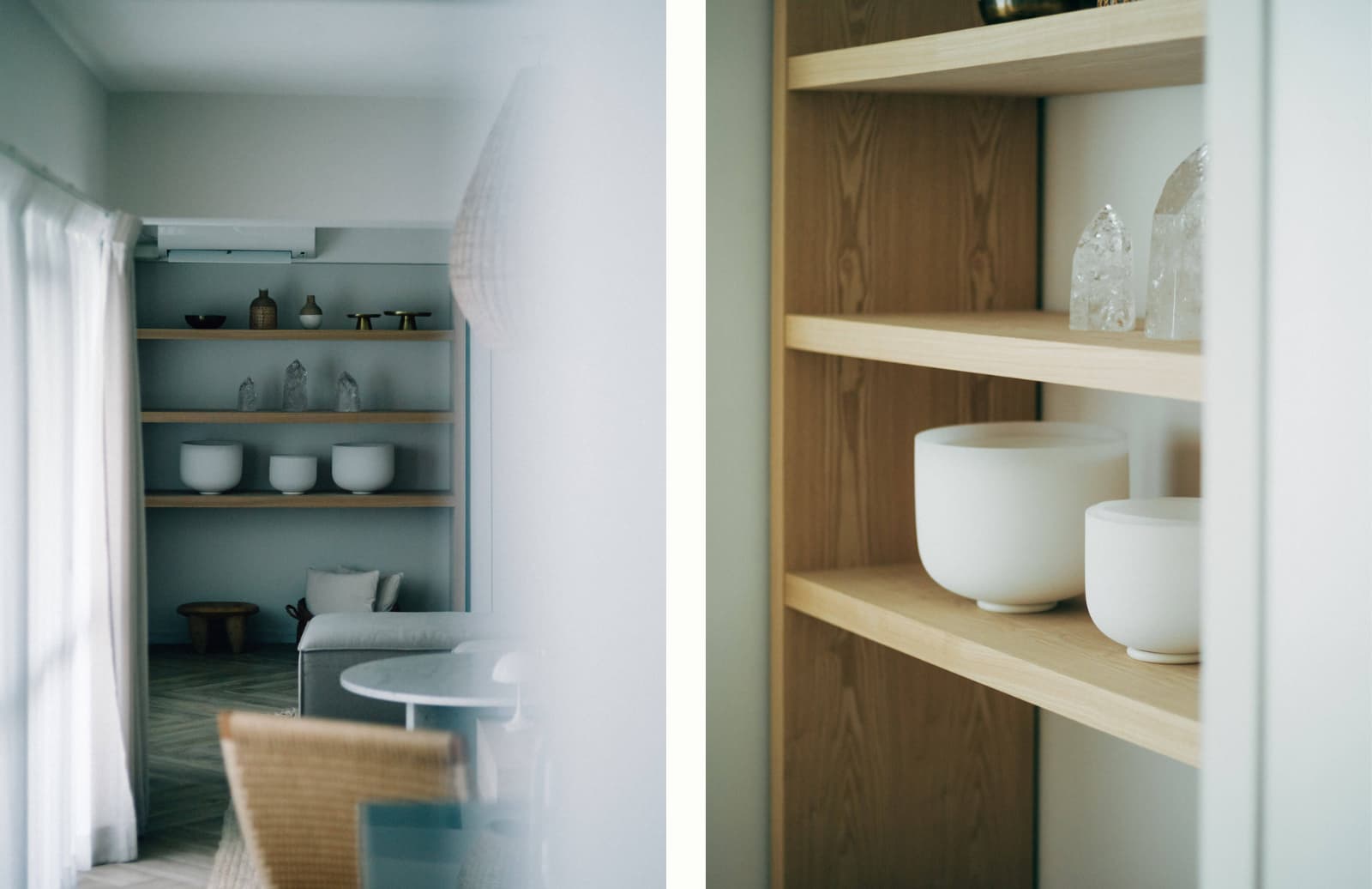 物心ついた頃から不思議と鉱石が好きなんです。自分が手がける塗香やリップバームといった商品にも、クリスタルを含ませるほど。揺るぎない何かに惹かれる。そばにあるだけで、自分が整っているのを感じるし、何より人間より遥かに長い時間をかけて形成された姿に安堵感を覚えるというか。地球上にはさまざまな種類の鉱石がありますが、自分はクリスタルが一番フラットに感じるので好きです。インテリアとしても。