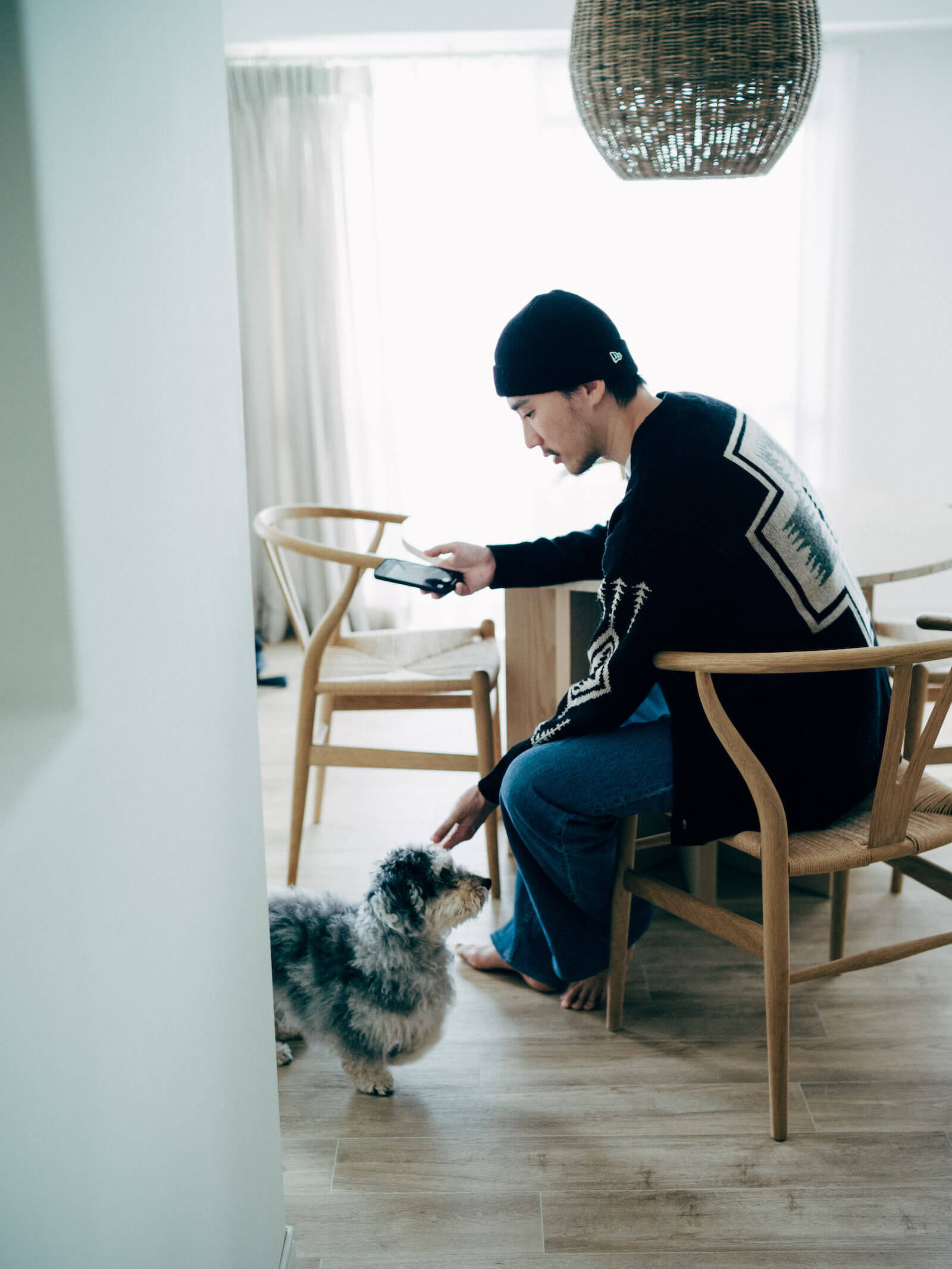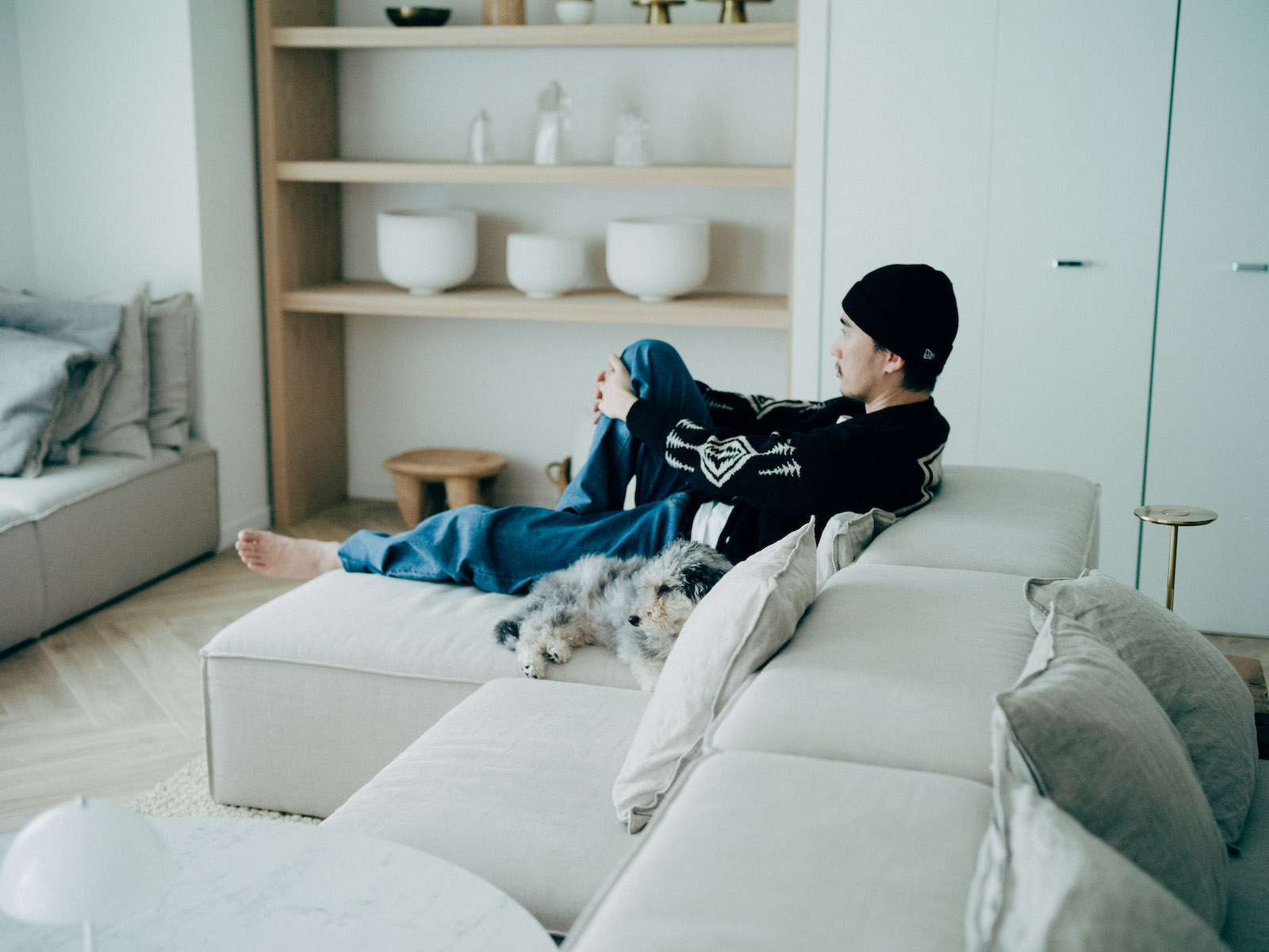 ファッションデザインからアートクリエイションまで、さまざまなフィールドで活躍する三浦大地さんのご自宅を取材。区切りのない間取りに惚れ込み、愛犬と共に移り住んだという自宅には、固定概念を軽やかに飛び越えた、たゆたうように軽やかに暮らす彼の世界があった。