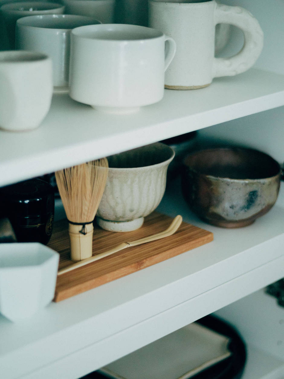 食器棚には、茶道の道具が日常使いの器と一緒に並ぶ。