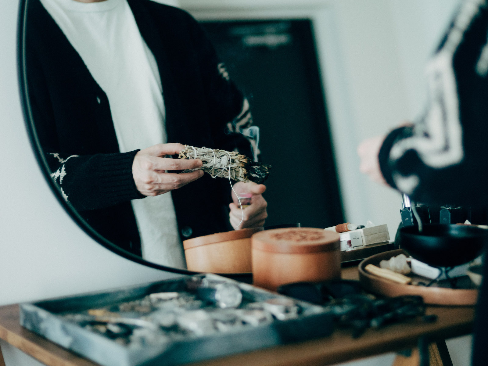 玄関前にあるのは、自分の好きなものだけを置いた“祭壇”。時計、アクセサリー、メガネなど、外出するときに身につけるアイテムが並ぶなか、大きなホワイトセージが一際目を引いた。時々セージに火をつけては自分という器も物も浄化するんだそう。部屋に植物をおかない代わりに、“香り”で自然を取り入れる、一つのアイデアとしてオススメ。