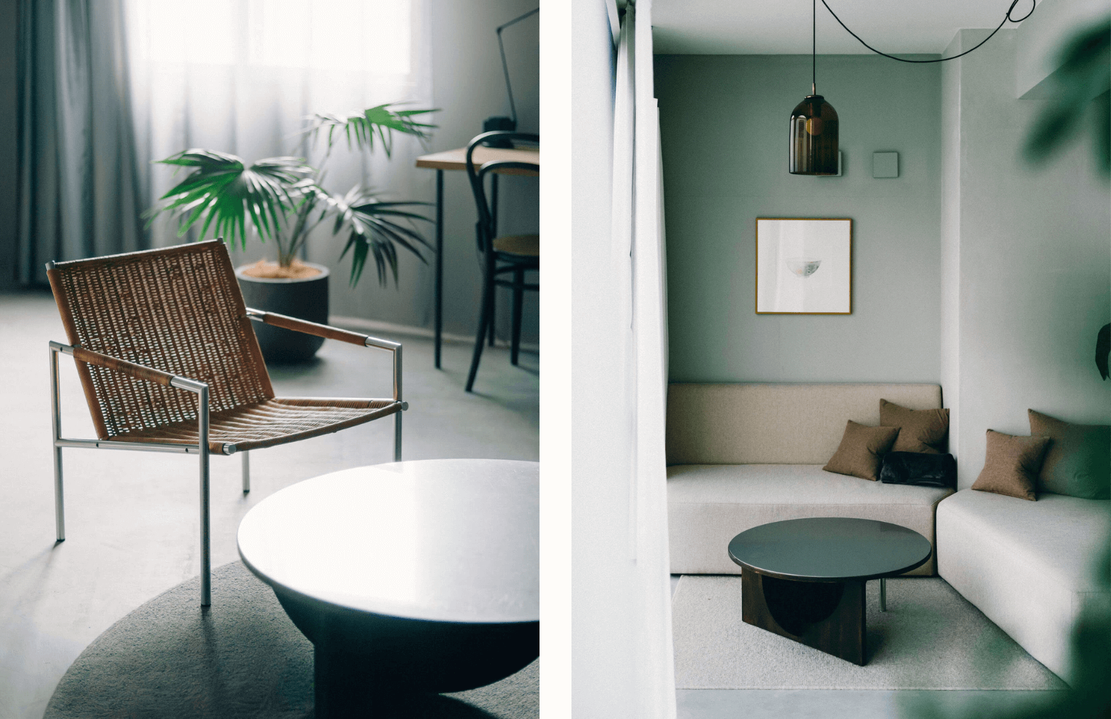 採光が限られる「ハイフロアスイート(サウナ)」の部屋では、ステンレスと藤素材でできたスペクトラム社のアームチェアを合わせ、窓から光が注ぐ「ハイフロアスイート(ビュー)」の客室では重量感を纏うローソファと合わせる。空間によってコーディネートを変えることで、軽快さと重量感のコントラストをさらに引き立たせる工夫が見えた。