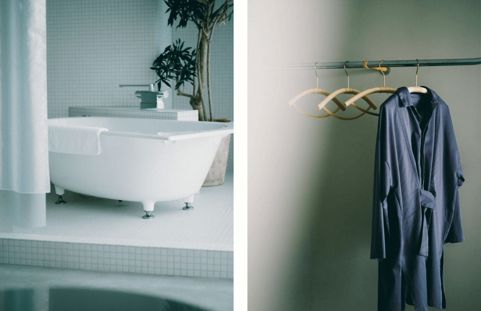 ちなみに、アーチ窓が備わる「ハイフロアスイート(ビュー)」の客室では、湯船に浸かって景色が楽しめるように、浴槽の角度をミリ単位で調整したとのこと。リビングや寝室にバスルームが直結する欧州のホテルのように、ここでは最も眺めの良い場所を浴室に設定している。寒さ厳しい金沢の冬も長く入浴できるようにと、浴槽は琺瑯素材だ。スペシャルな眺望の特等席が浴室、そんな選択肢を自宅に取り入れるのも面白い。