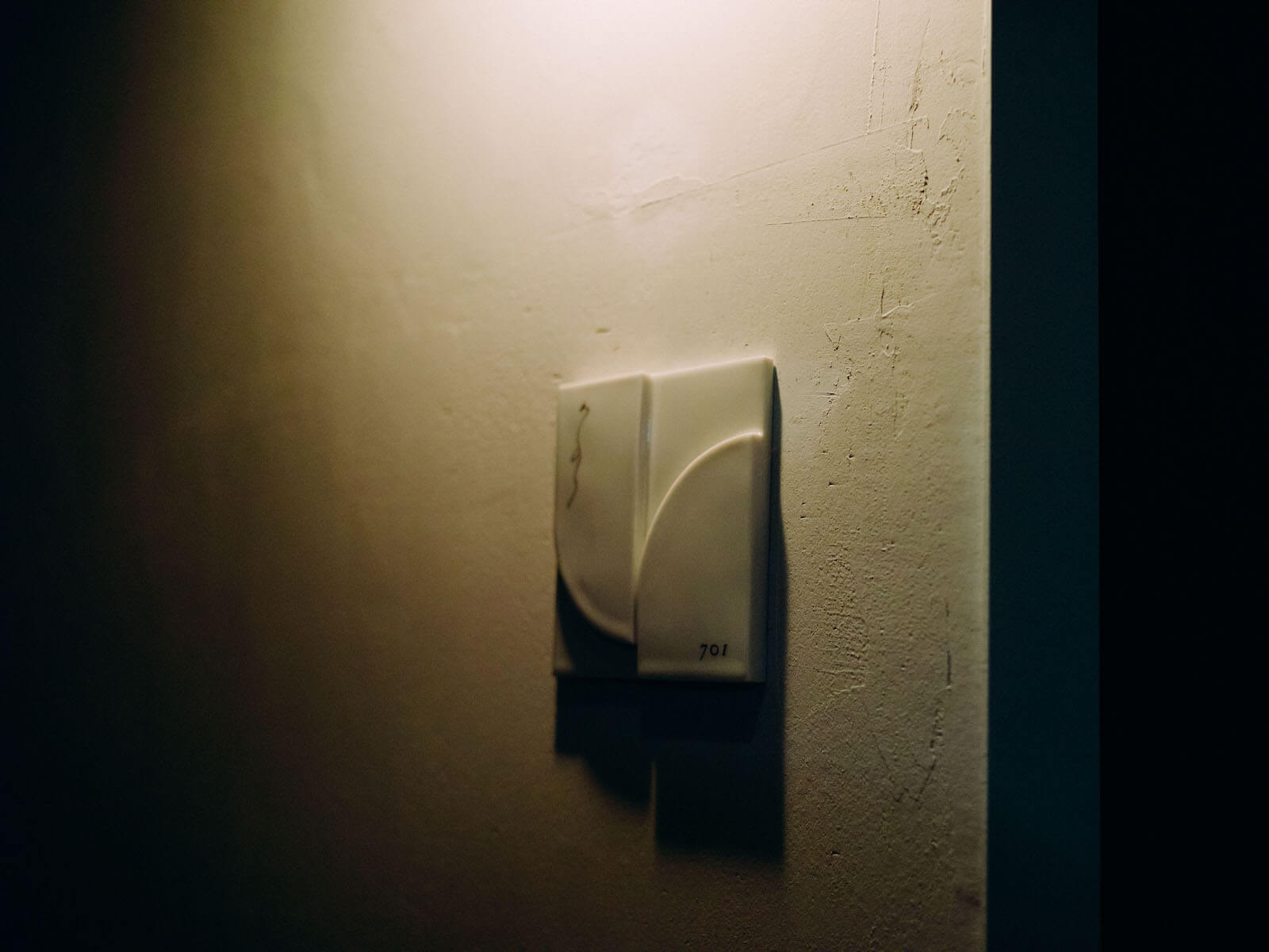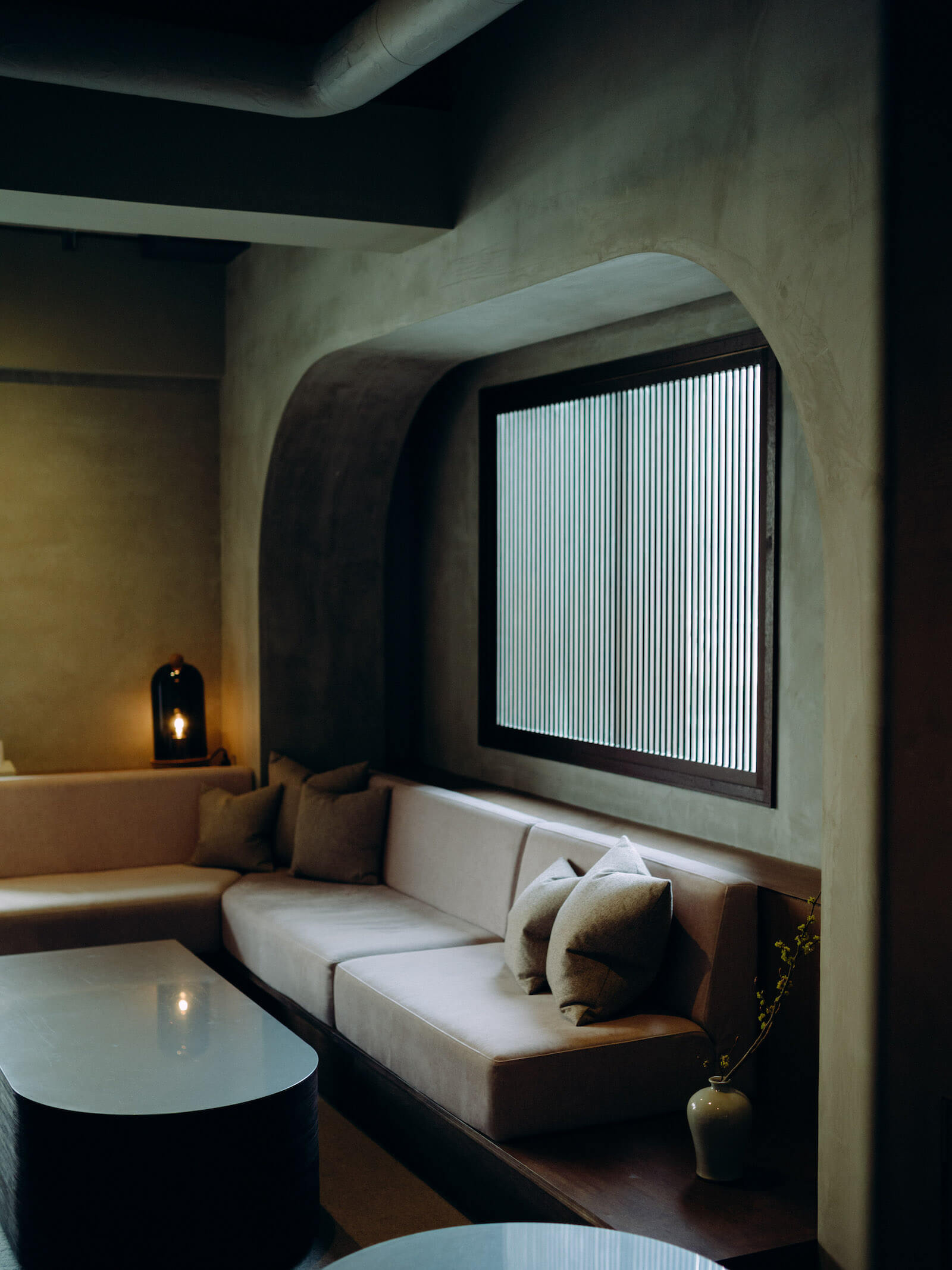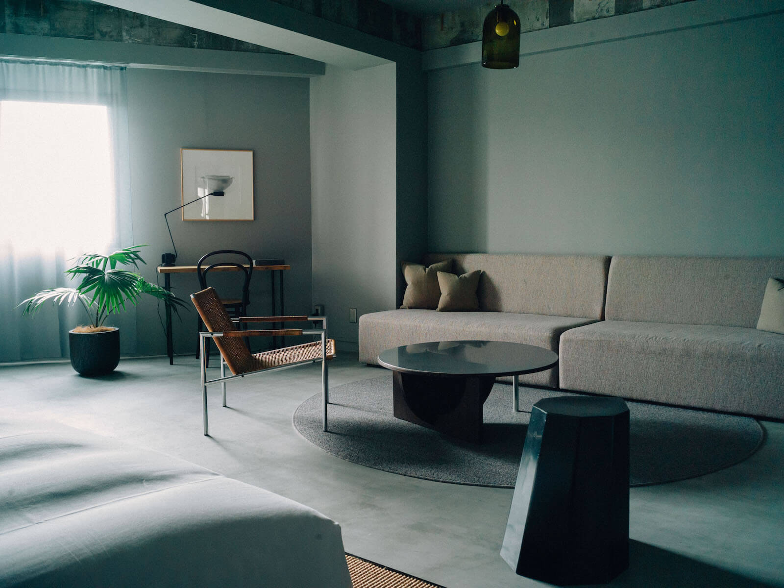 客室での時間が、緩やかに感じる。その理由は、暗い部屋でも明るさに固執しない空間づくりにあるのではないだろうか。表の大通りに面したアーチ窓のある部屋は自然光が注ぐものの、奥の部屋に行けば行くほど採光は取れない。だからといって壁を白く塗ったり、インテリアに彩色を加えたり、照明を多用することはない。モルタル仕上げのグレーの世界で、この深みのある時間を享受しているのが印象的だった。