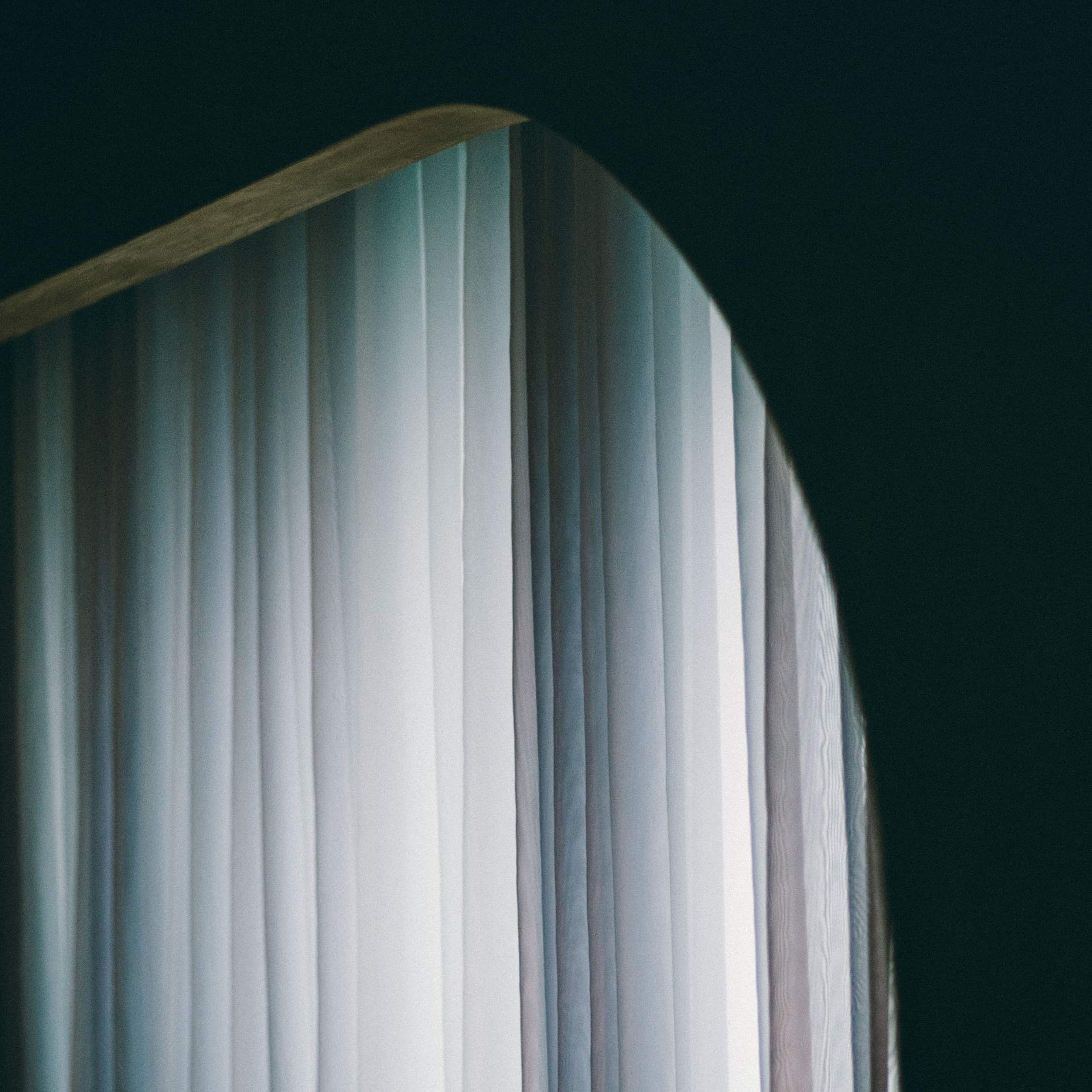 次に、香林居の中でも採光の取れない側に位置する「ハイフロアスイート(サウナ)」へ。ドアを開けると、一瞬視界に光が反射した。よく見ると、目の前でカーテンが揺らいでいる。ドアを開けたとき、ベッドルームやリビングが丸見えにならないための配慮のようだ。ただし、普通の布ではない。透明の繊維で織られたカーテンにはアルミ蒸着があしらわれ、吊すと薄い金属がユラユラと揺れているように見える。これは大阪の「ファブリックスケープ」が手がける製品で、明るい春の波間を思い出す。生活用品のカーテンではなく、もはやアートに近い。