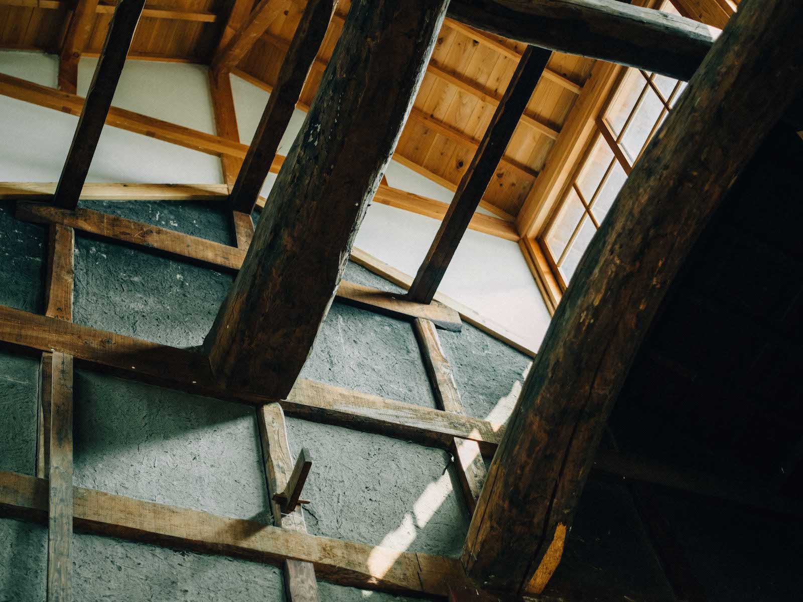 「どの時間帯でも光が入るように、二階にぐるっと窓を増やしたんです。おかげで、剥き出しになったケヤキの梁が美しく見えるでしょう」