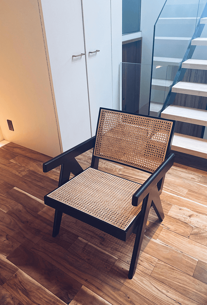 1,2枚目は最近買ったもの。ピエールジャンヌレのラウンジチェアは、多様なリプロダクトの中からこの家に合うモダンな製品をチョイス。最近気になる器は”揺らぎのあるもの”。群馬県「うつわ ぬくもり」のボウルと、楽天で購入したという作家「原光弘さん」のコップ。3枚目はアトリエの一角。空間に合わせて描き下ろした油絵と、作業の合間に楽しむ「櫻井焙茶研究所」の茶葉たち。「Aesop」の写真集は、家づくりにおいて“世界観の共有ツール”として使用したそう。