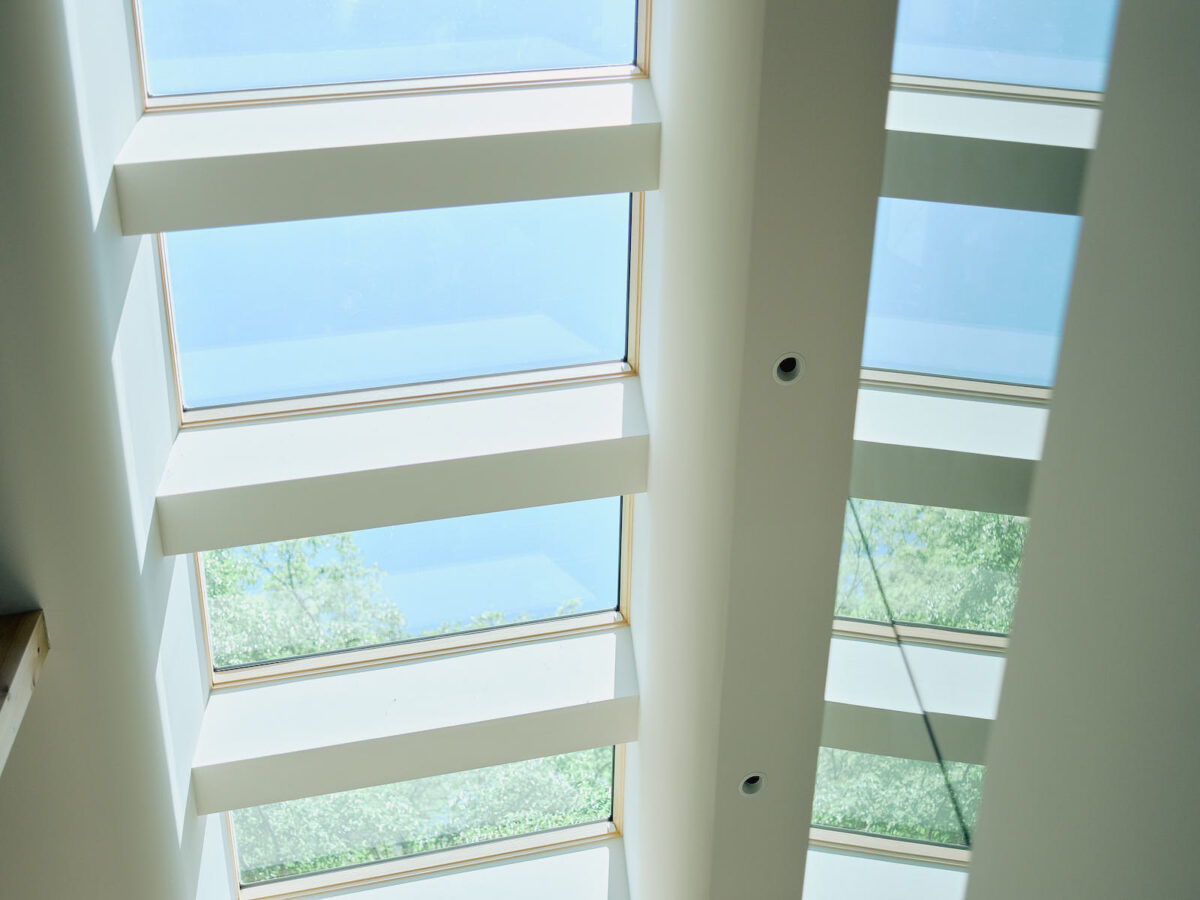 採光があまり得られない敷地のため、天窓から自然光が入る施工に。天井を曲面にすることで、光が拡散する仕組み。