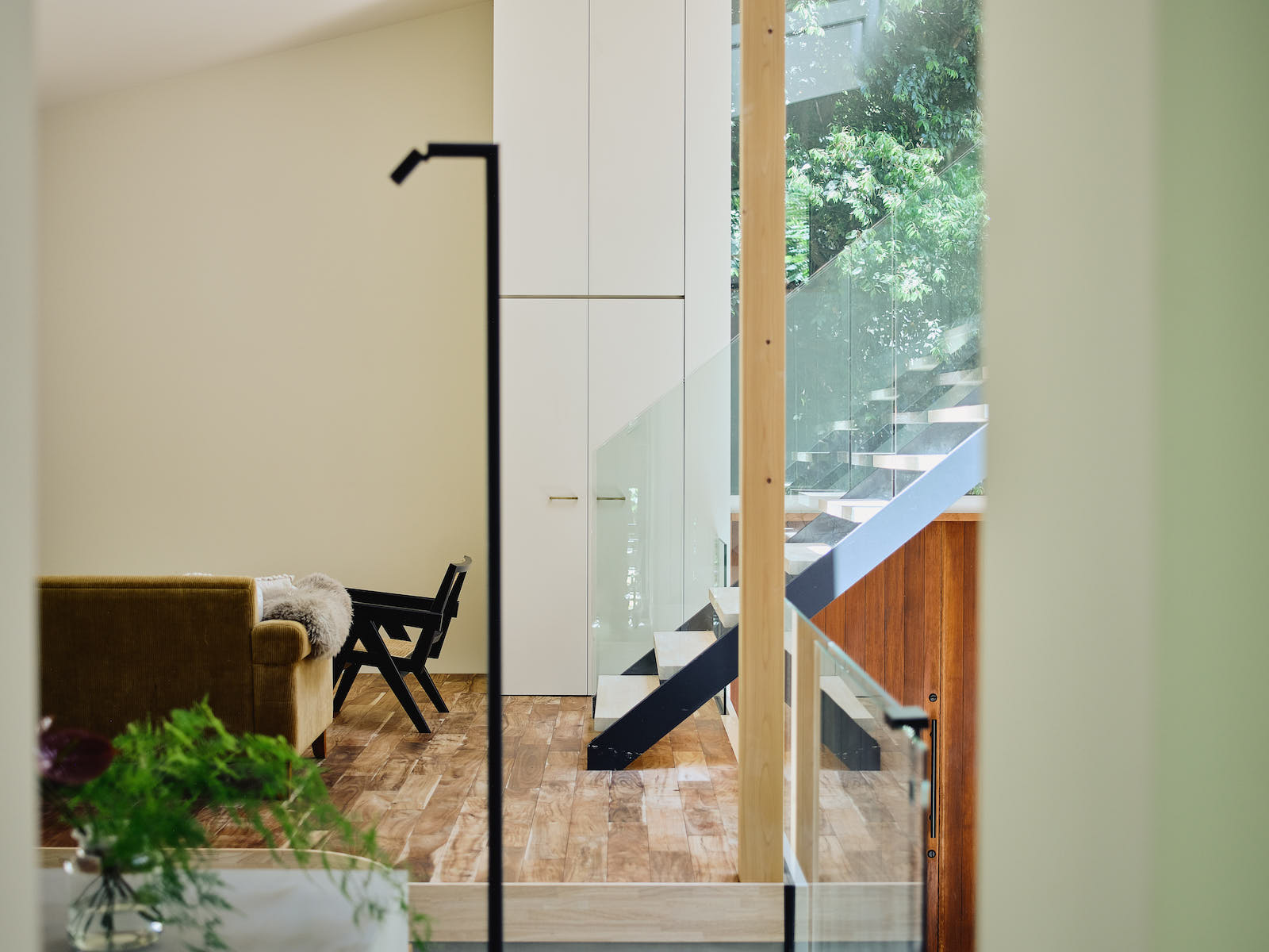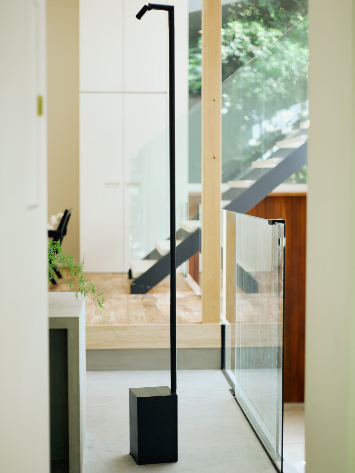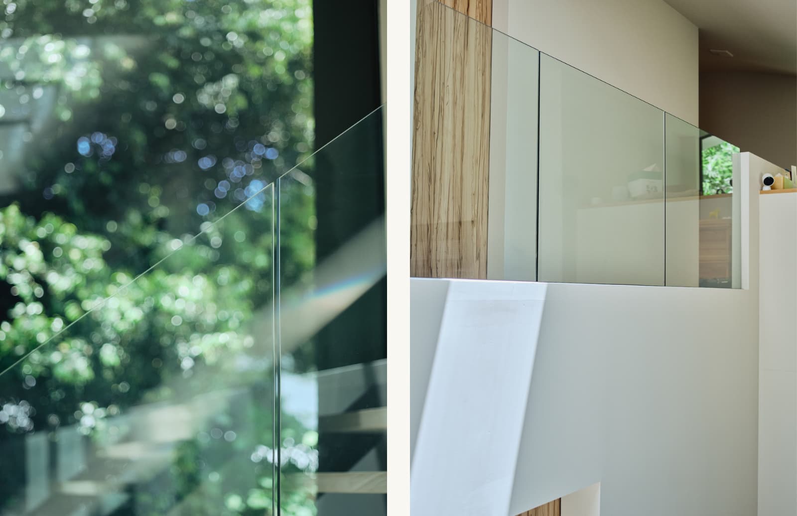 階段の両サイドには、ガラスの手すりを備えた。これで、二階からの視界を遮らない。「娘がどこにいてもなんとなく気配がある、どこで過ごしてもみんながつながっている、そんなシームレスな空間になりました」