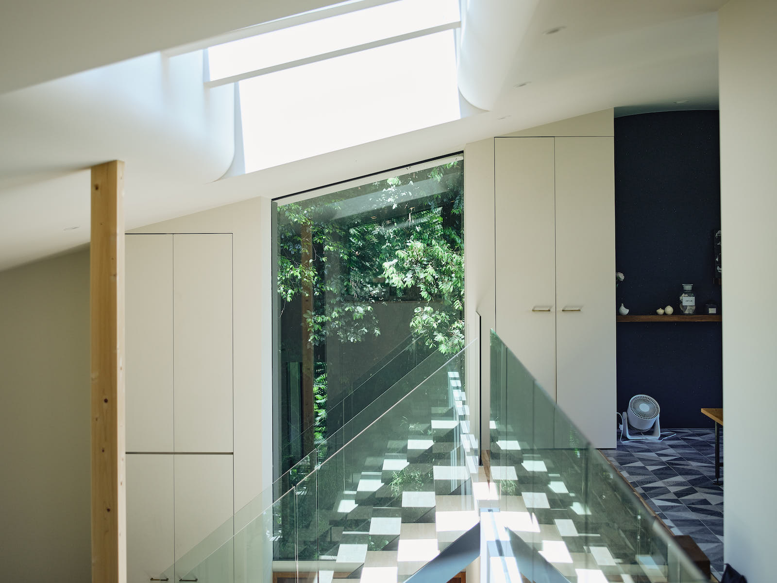 酒井さんがお気に入りの、四季を眺められる天窓。鎌倉山の木々が顔を覗かせ、ここからも自然の移り変わりがわかる。さっぱりした快晴の健やかさも、リズミカルな雨の音も、心が安らぐ星空も、起床した瞬間から物語のように始まる。