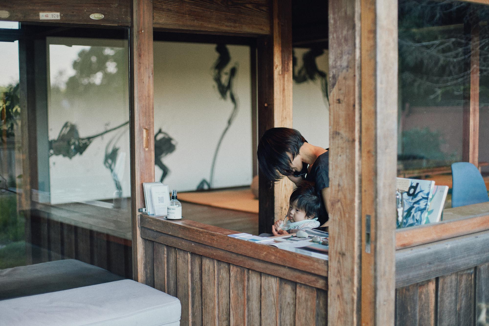 梅守さんの定位置となっているのが、一番にお客さんを迎えられる母屋の玄関脇のカウンター。以前は、村の人が電話を借りに訪れる場所だったそう。