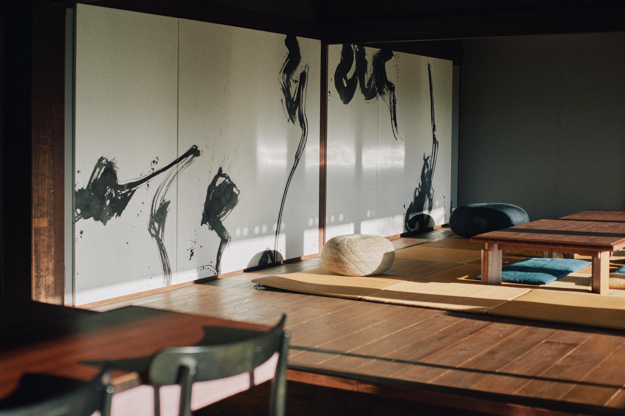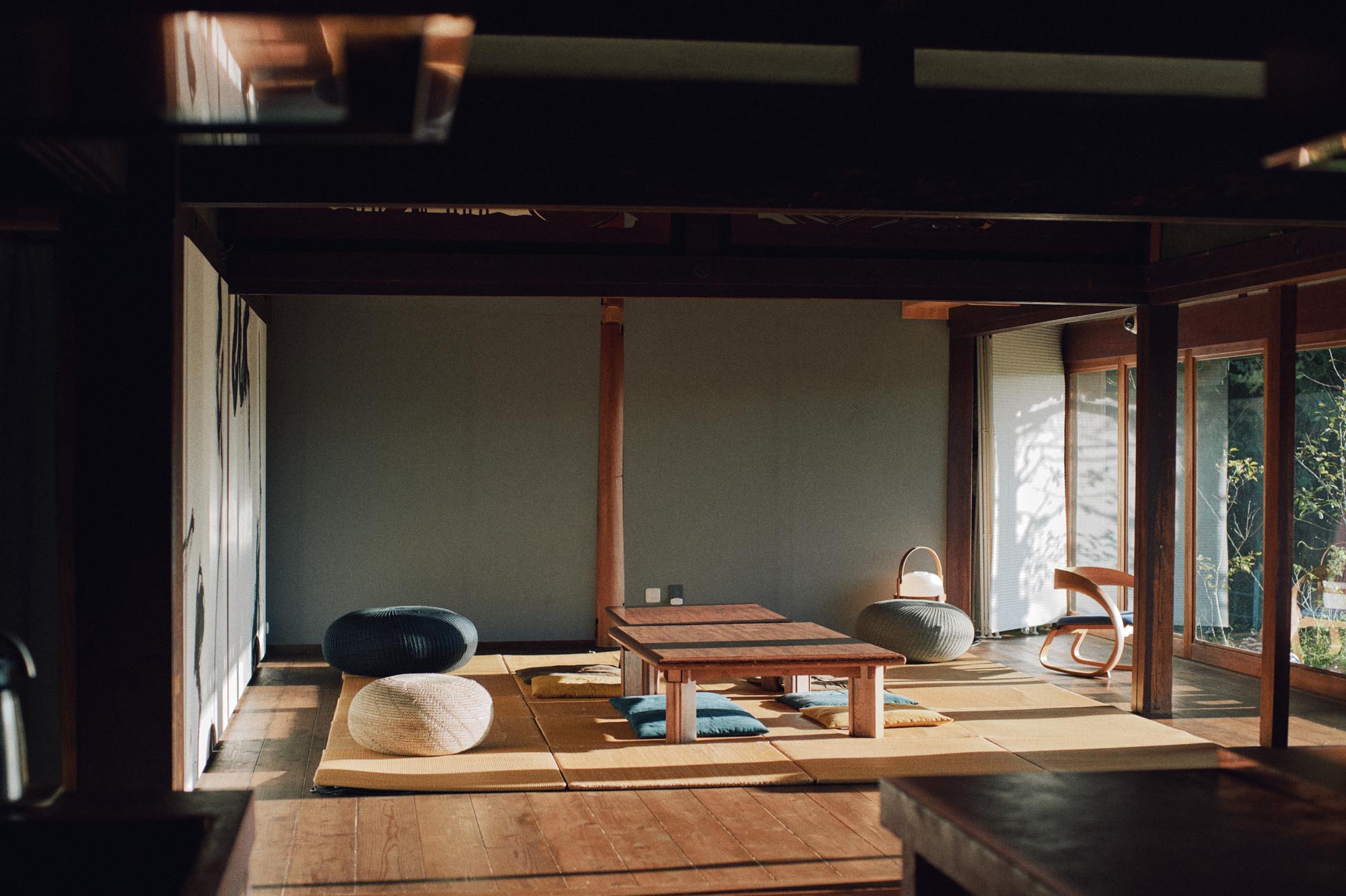 美しい欄間の下には畳の共有スペースが広がり、ここではゲストが横になっていることも多い。