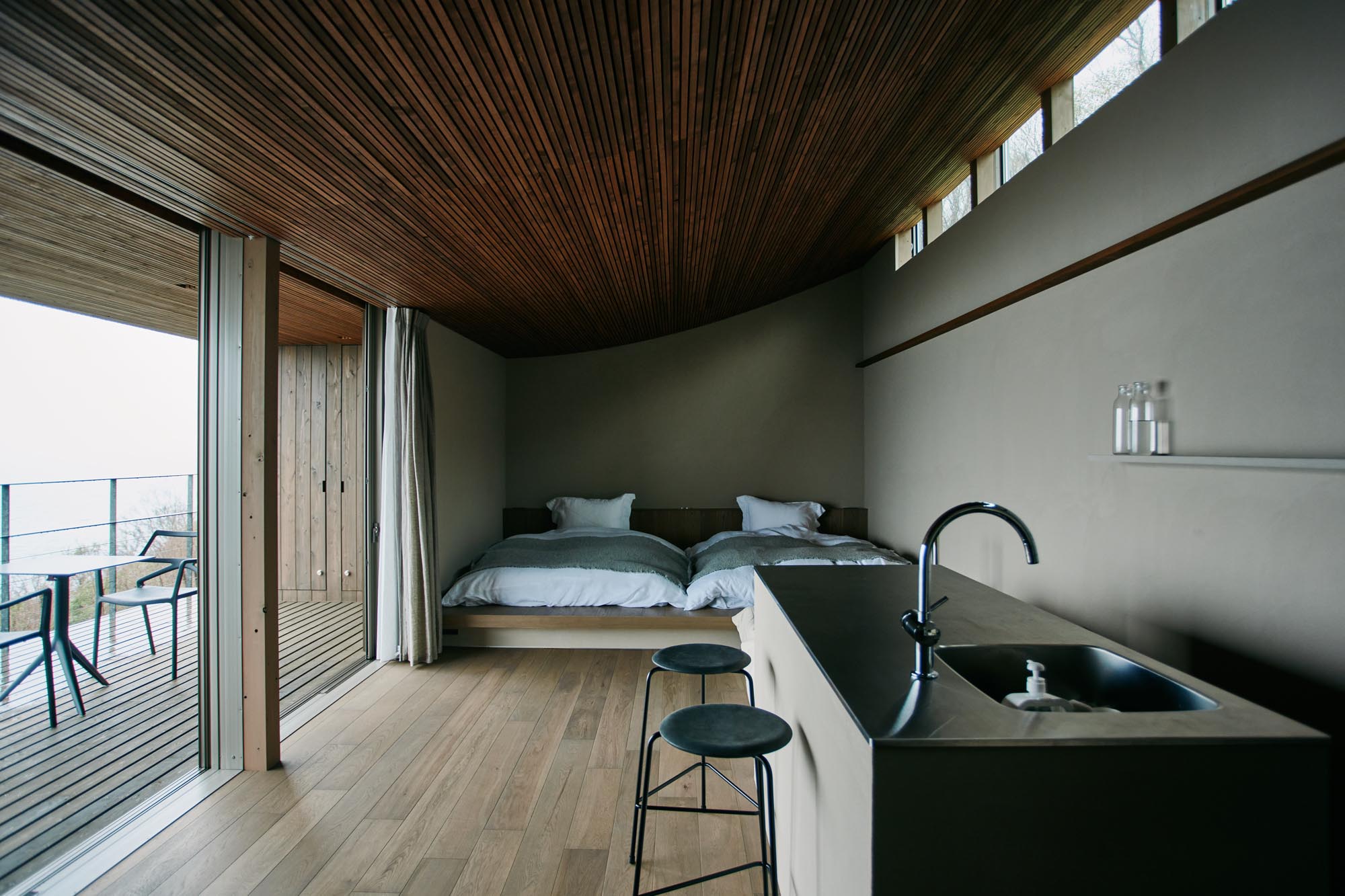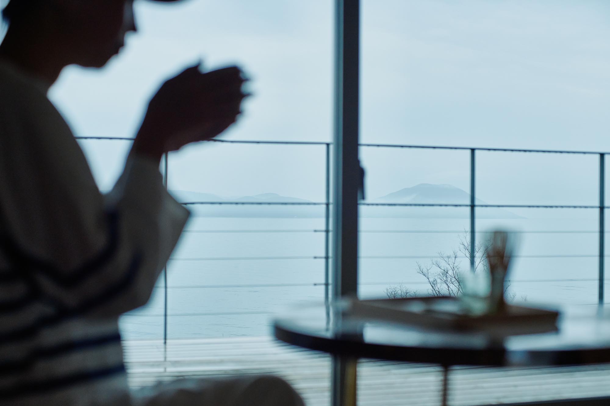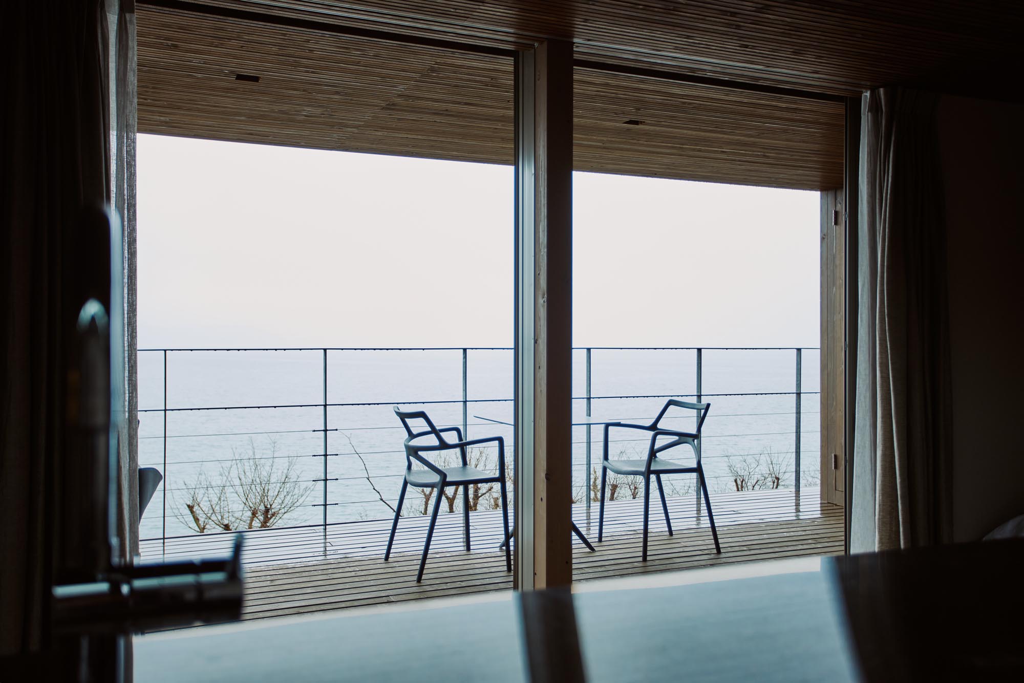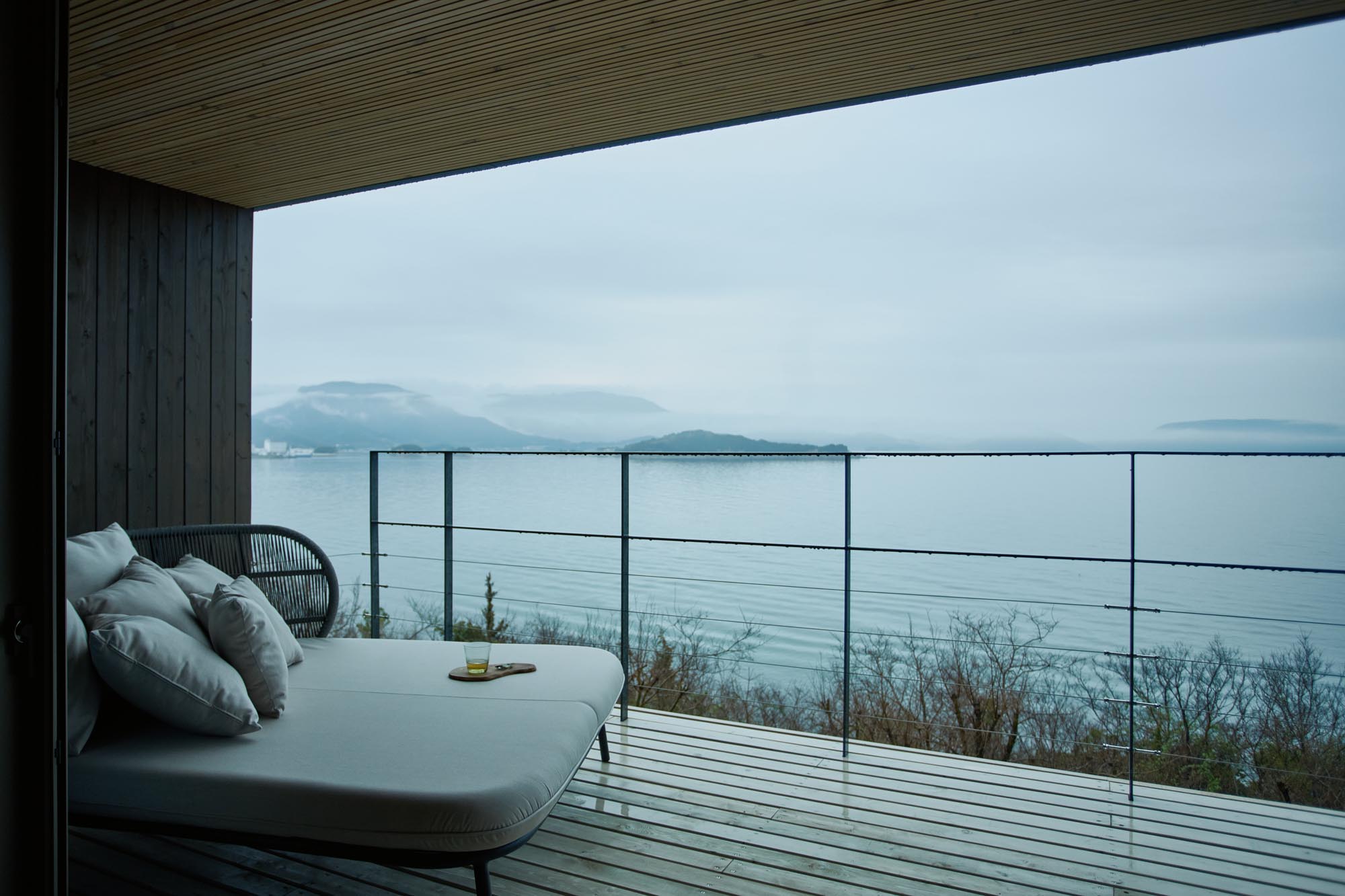「The STAY」の中に入ると、どの部屋も圧巻のシーフロント。大きな開口を設けた窓からは、小豆島の海が静かな波を寄せていた。