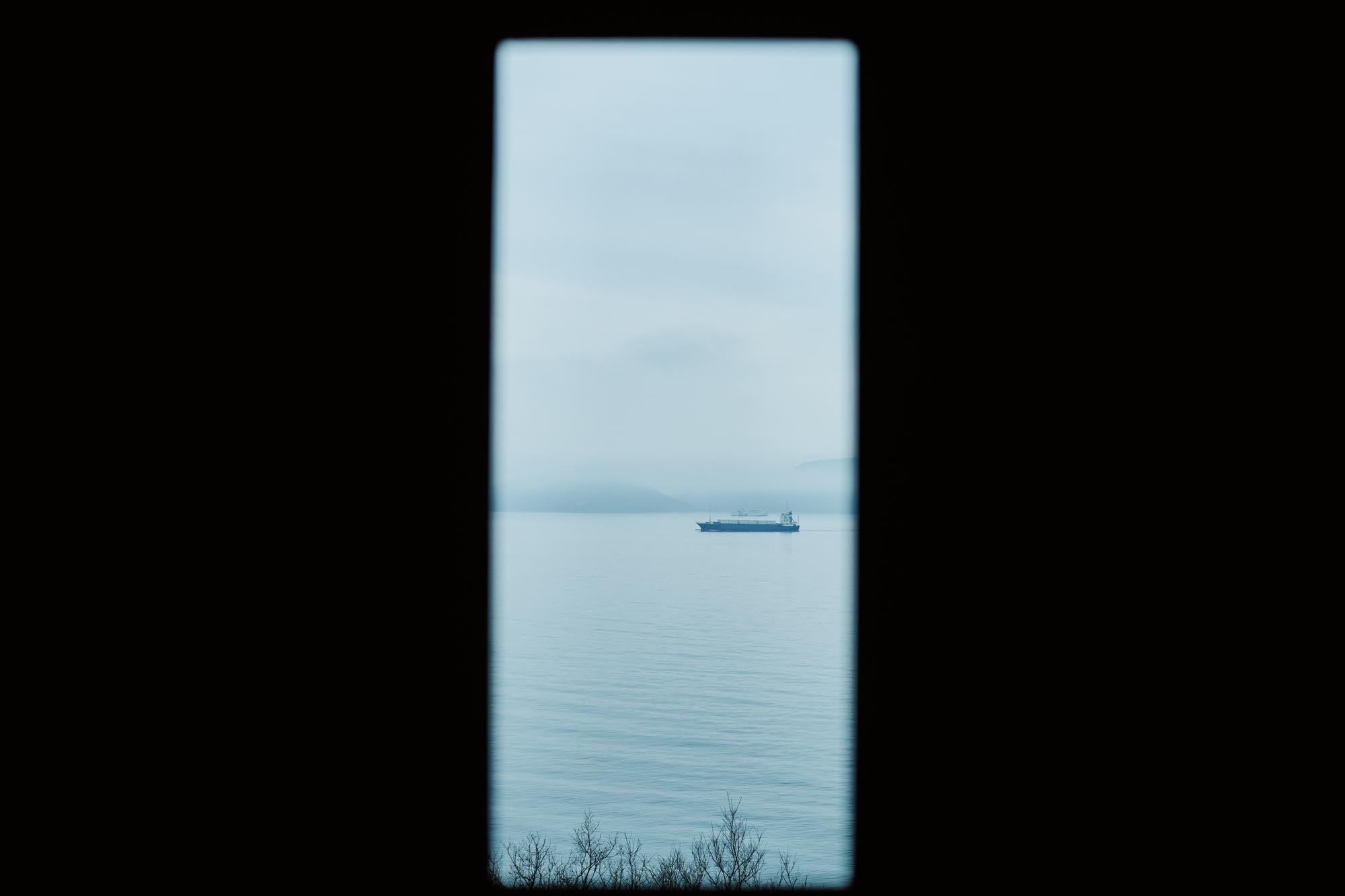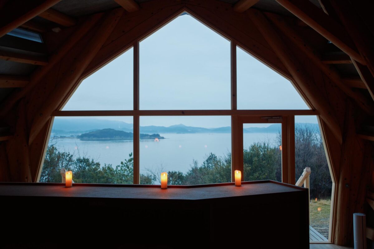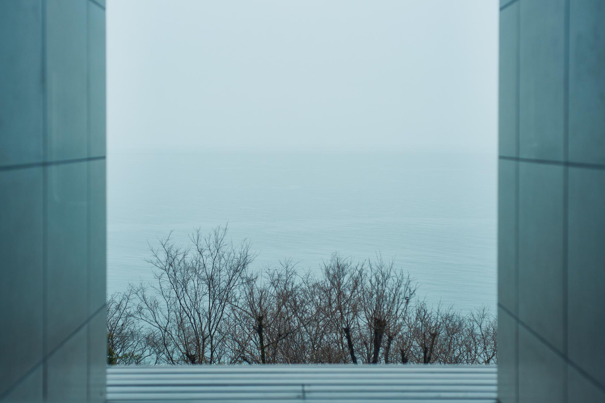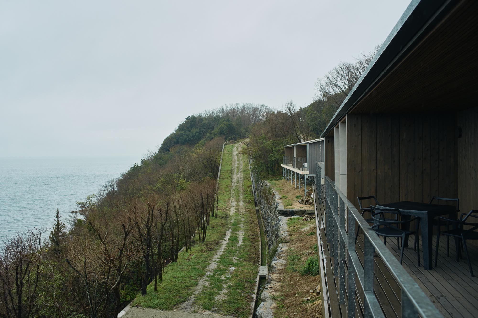 「The STAY」の中に入ると、どの部屋も圧巻のシーフロント。大きな開口を設けた窓からは、小豆島の海が静かな波を寄せていた。