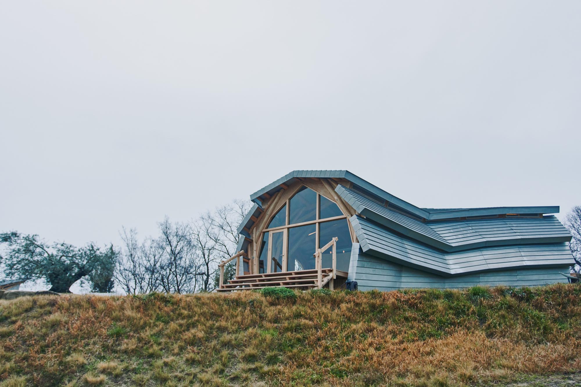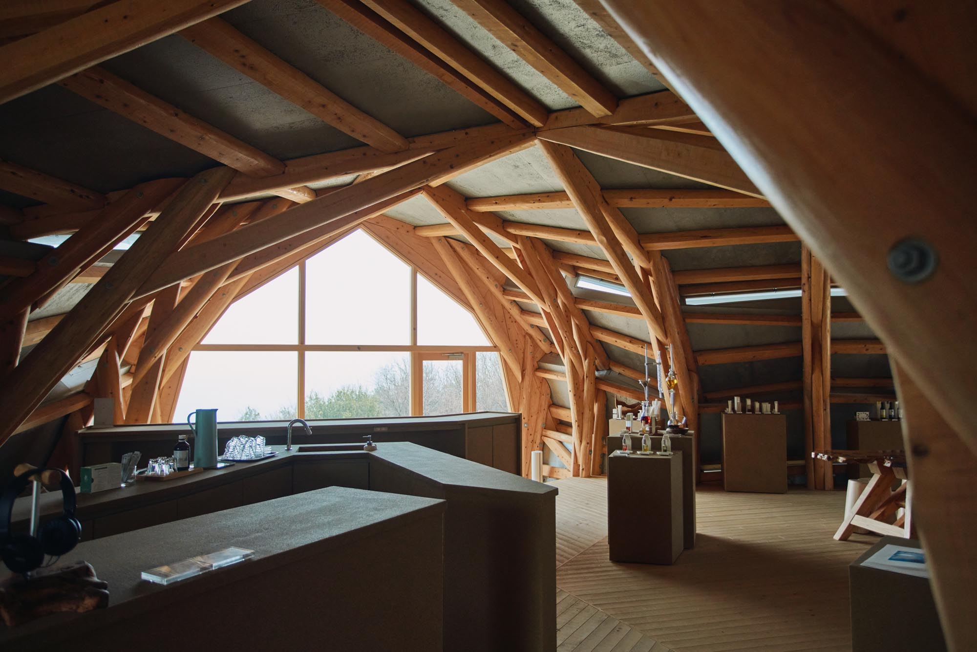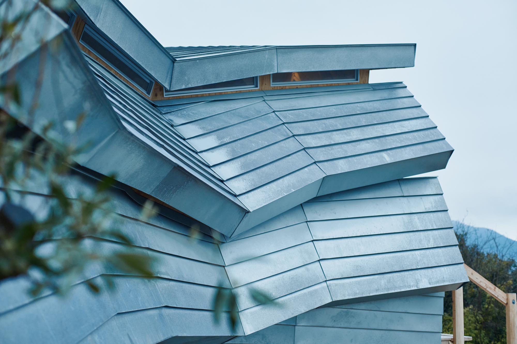 大きな丸太でチタン合金板の屋根を支えるダイナミックな構造。長く続く建築を目指し、外装は腐食しにくいジンクという合金で仕上げた。まるで今にも動き出しそうな、生命体そのものである。