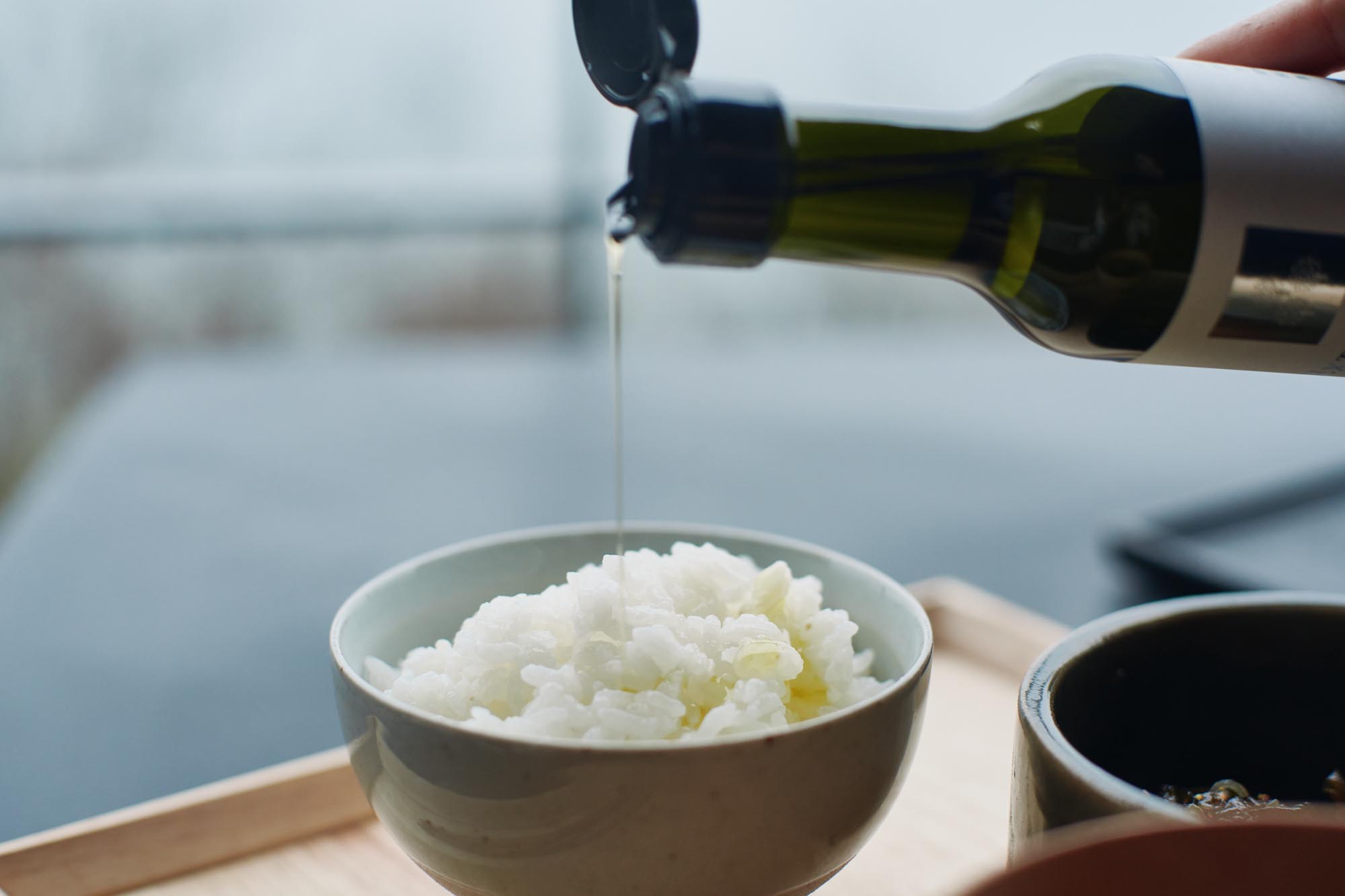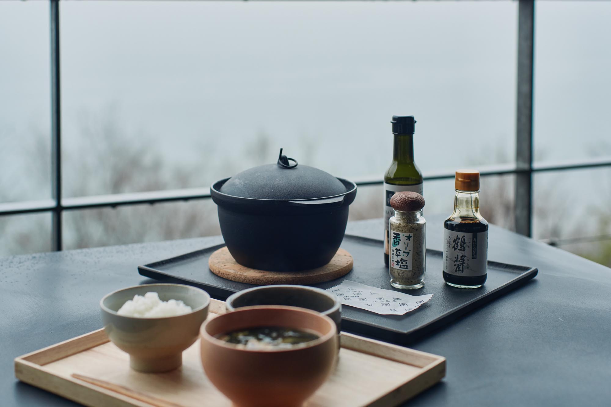 朝食は小豆島産の白米を自分で炊いて、できたてをいただくスタイル。熱々のごはんに自社農園のエクストラバージンオリーブオイルと塩、醤油を数滴垂らすと、普段食べ慣れた白米がまったく別の物に。