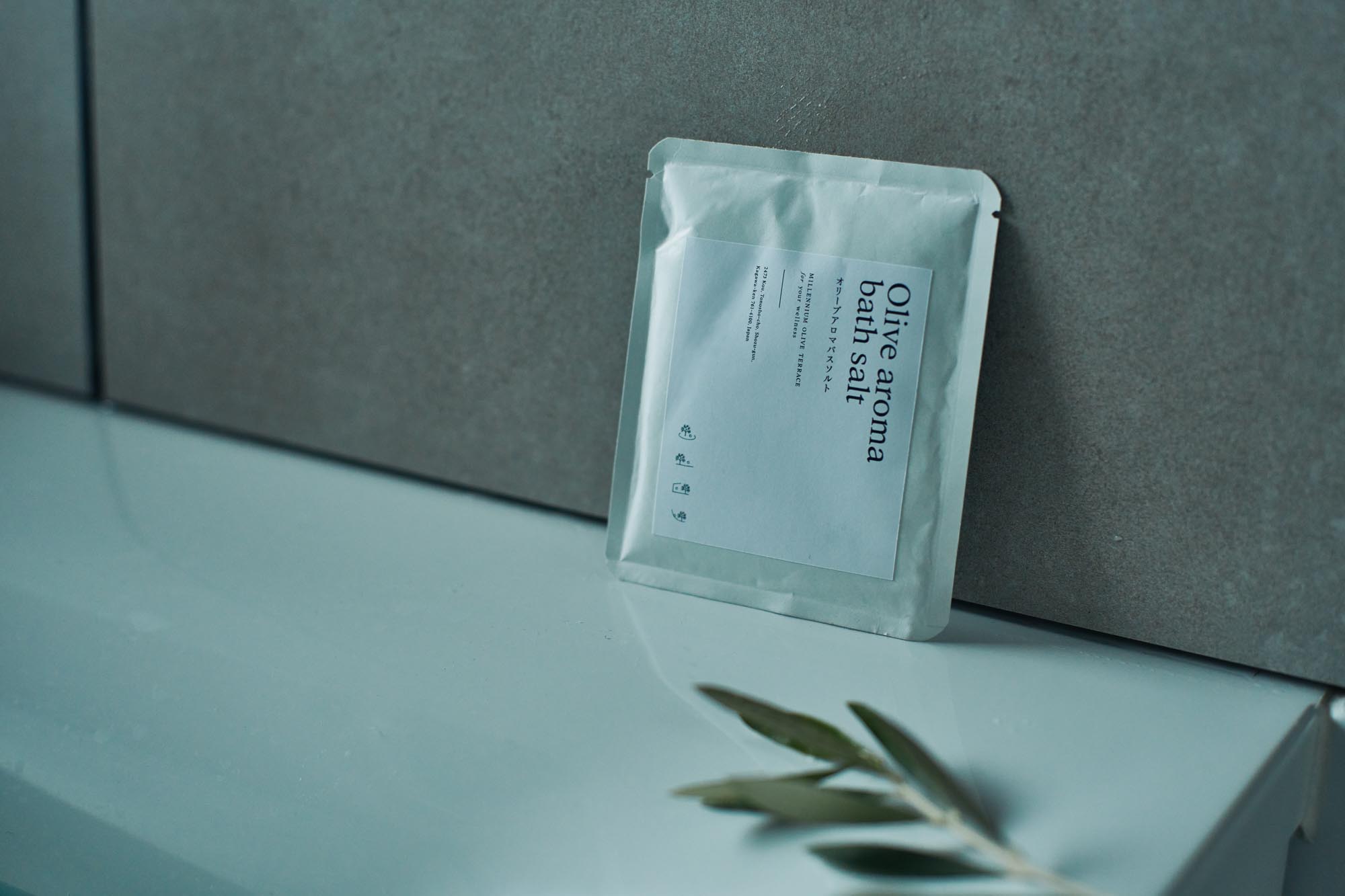 日々の喧騒を離れ、ニュートラルな自分に立ち返るように、心がととのっていく。オリジナルのバスソルトは自社の美容オリーブオイルに数種の精油を用いたもの。細やかに用意されたアメニティがうれしい。