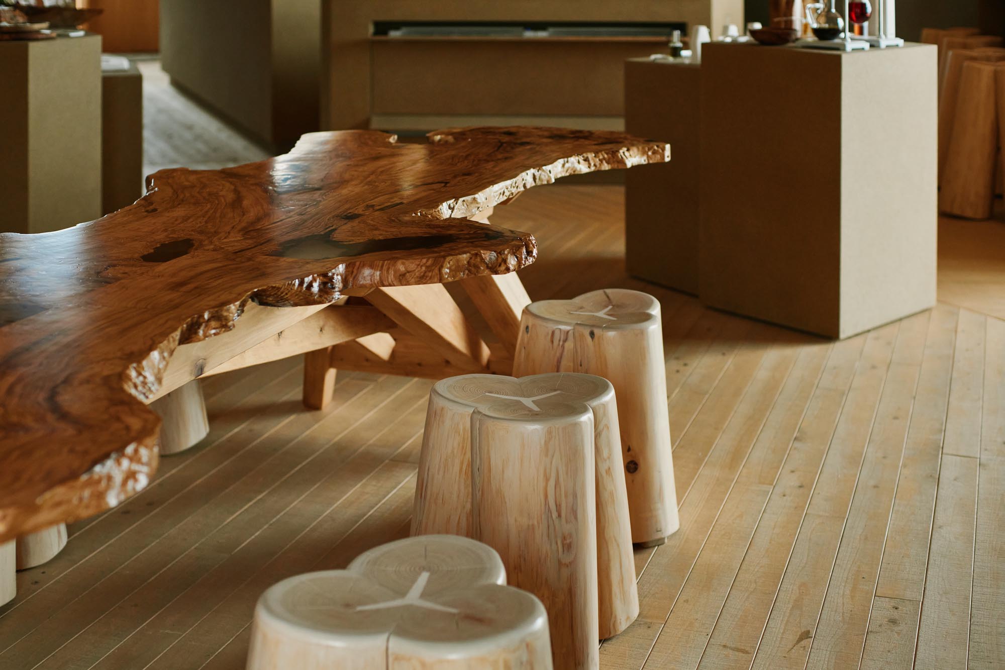 「The GATE ROUNGE」のビッグテーブルは、チュニジアの間伐材のオリーブを天板に活用。平面形状とリンクするように三又形状になったスツールは、ヒノキを用いて制作されたもの。