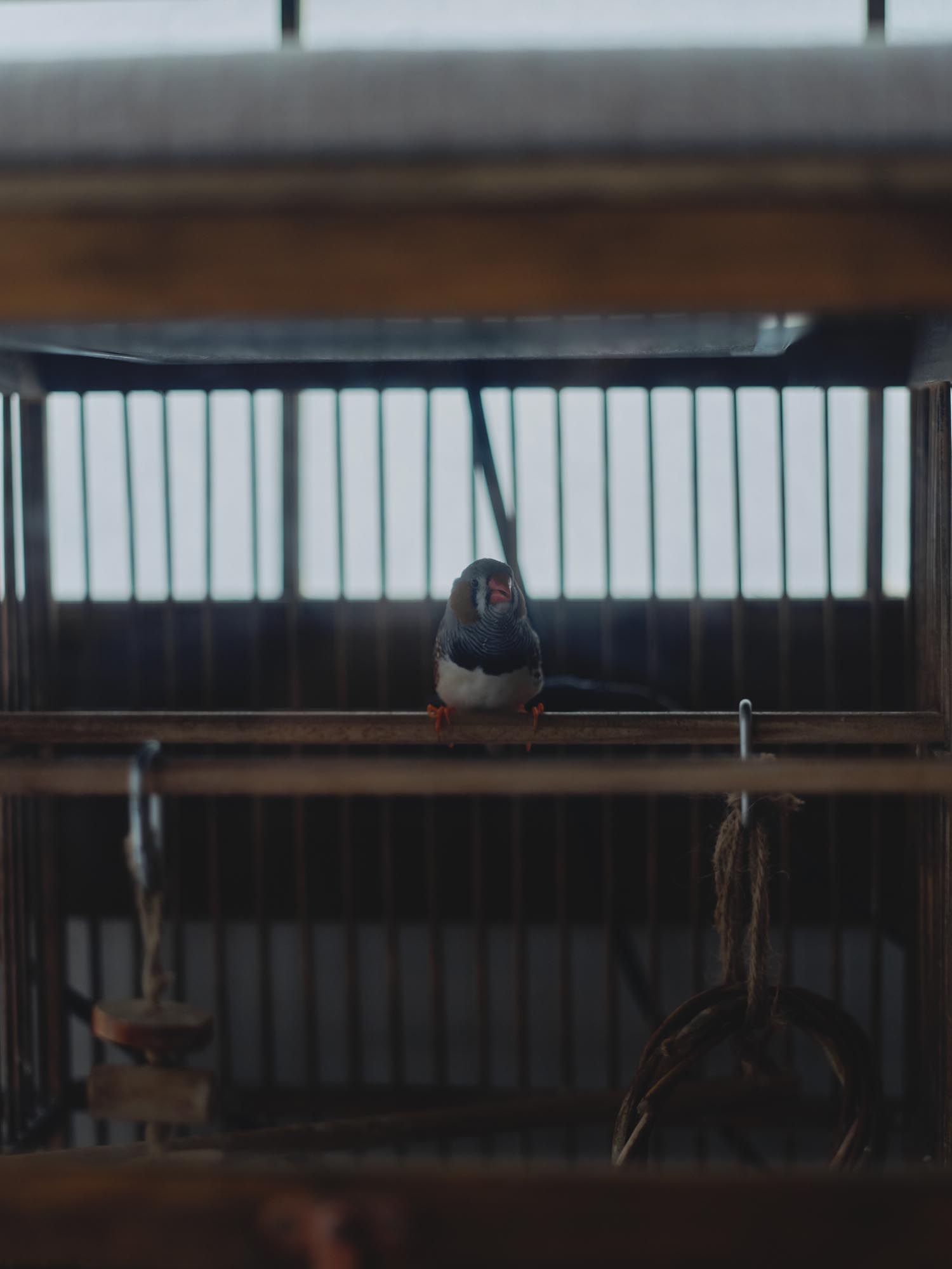 鳥たちのケージや、止まり木になるバードツリーも、茉夕さんの手作り。整った静けさのなかに、羽音がわずかに揺れる。