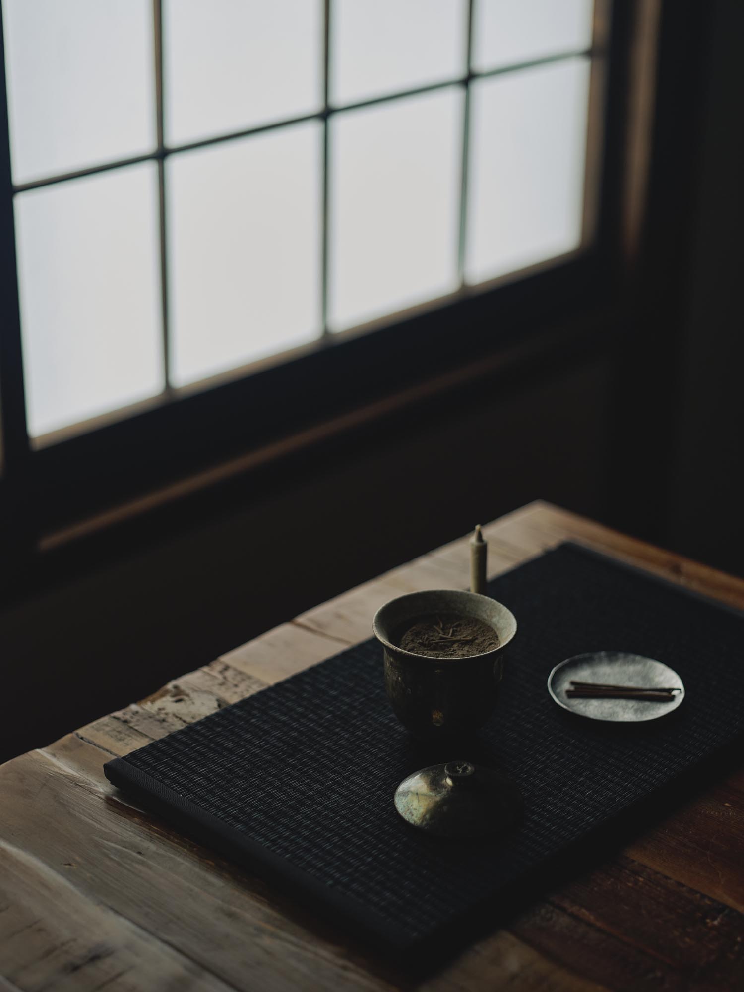 余白を生かしたものの配置。黒、茶、白の3色を基調とした落ち着いた色調──。