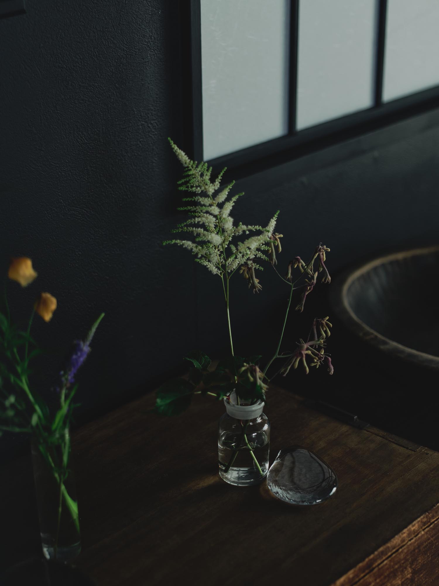 家のなかでも四季が感じられるよう草花は必ず飾っている。特にガラスの花器が好きで、これは最近、手に入れたもの。空間にふわりと浮かんでいるように見え、光を受けてわずかに揺れるさまが美しい。家のなかに風の通り道をつくってくれる存在。