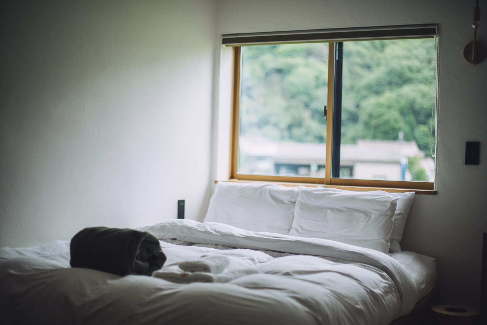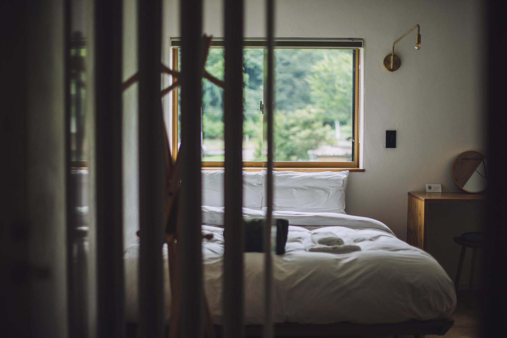 ドミトリー形式のファミリールームが1部屋、ダブルベッドが置かれた個室が2部屋。いずれもウッドを基調にしつつ、余白を持たせたデザインが心を落ち着かせてくれる。