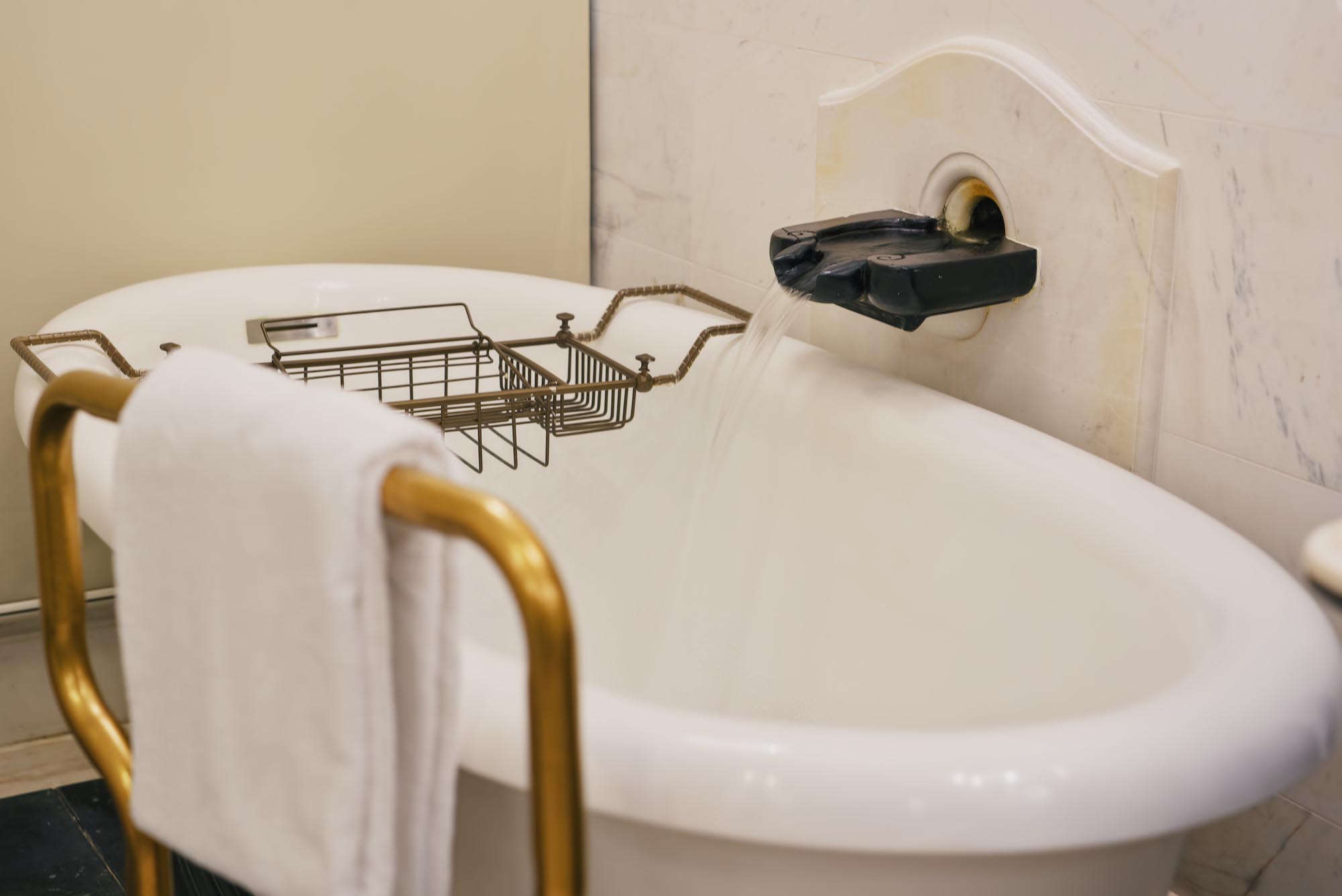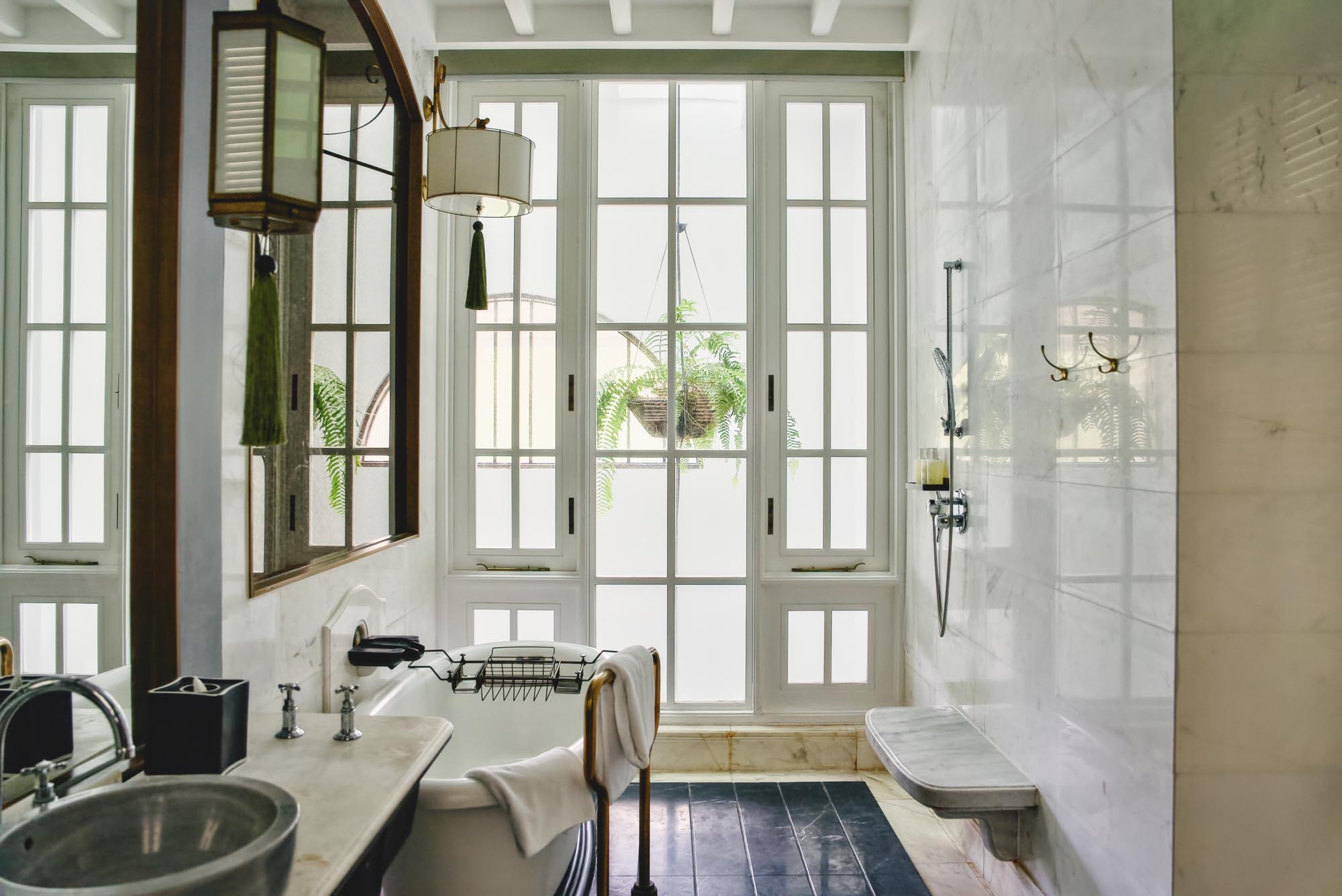 個人的におすすめしたいのが、ドラマチックなバスルームだ。通常のホテルの二倍以上の高さを取り入れ、壁一面の窓を眺めながらベトナムでは珍しい深めのバスタブに身を沈められる。
