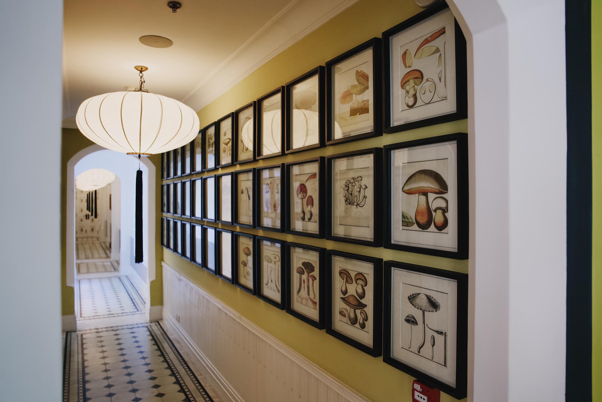 迷路に入ってしまいそうで胸が高鳴る長い廊下。天井や壁には、キノコのアートが優雅に並ぶ。乾燥キノコのサンプルを保管するために使われていたという植物学者のキャビネットもサロンに設置され、この建物が研究所だった名残を見つけるのが楽しい。