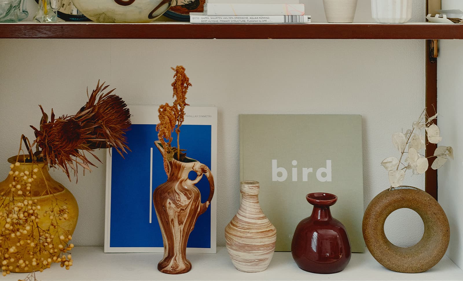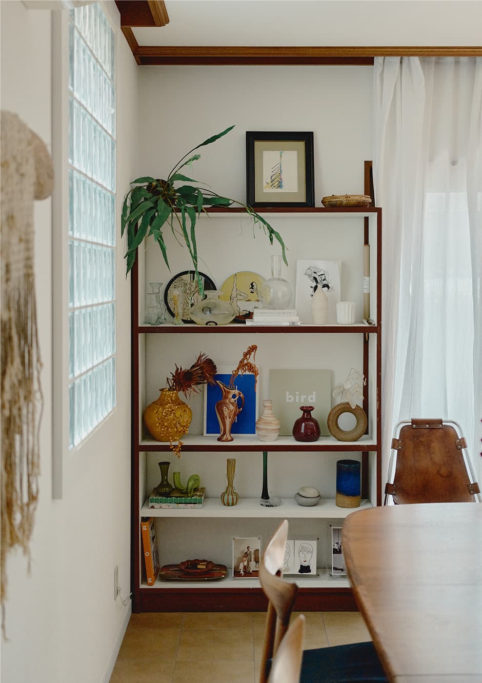 ヴィンテージショップで購入した棚の内側だけを白く塗り、フラワーベースなどの置き場に。
