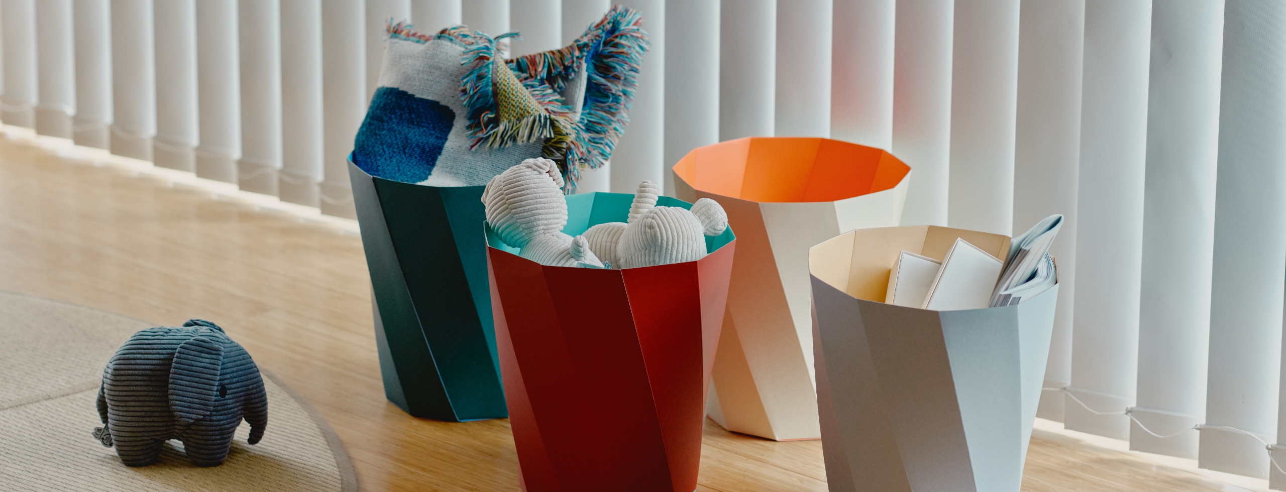 ゴミ箱として販売されている「PAPER PAPER BIN」を収納として部屋の真ん中に。ちょっとした小物も、大きなラグも子供のおもちゃも、部屋が雑然としてしまう前に放り込むだけ。FSC認証のリサイクル紙をコーティングしているので、汚れづらく実用性も兼ね備えたアイテム。外側が落ち着いた色、内側が発色のいい色になっているので、目立ちすぎることなくお部屋を明るくしてくれて、主役になれる幾何学模様のゴミ箱です。